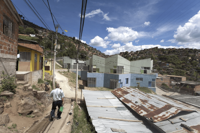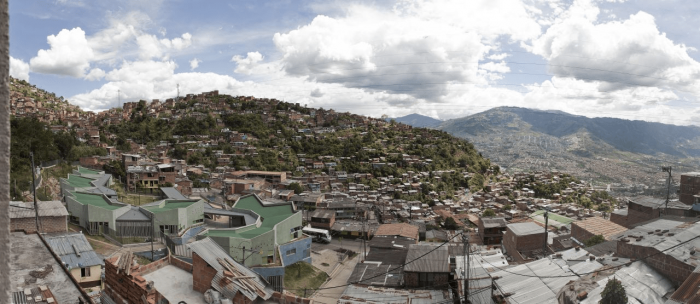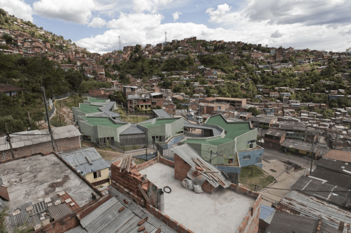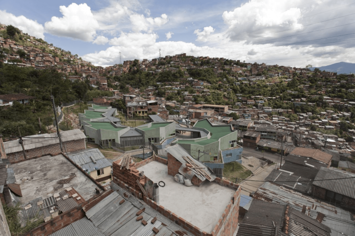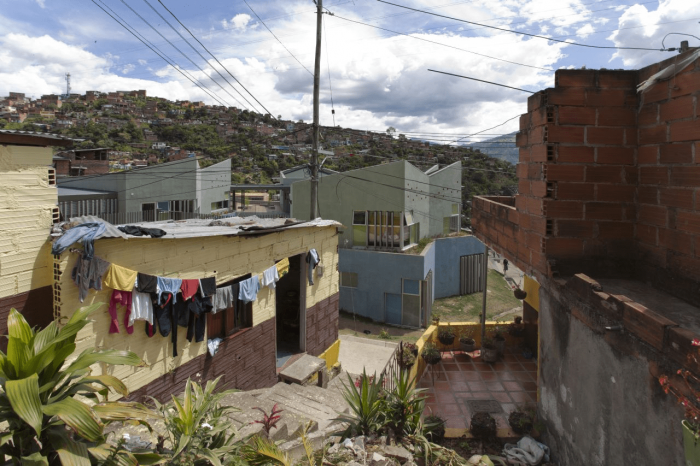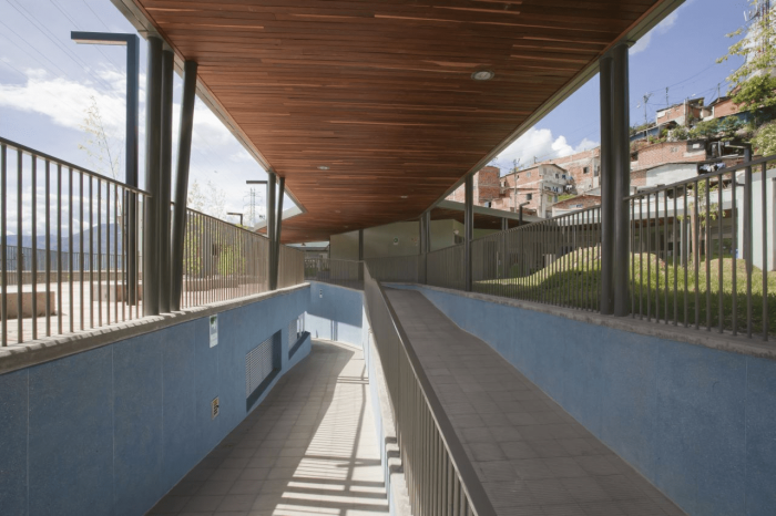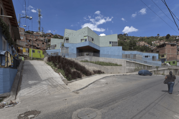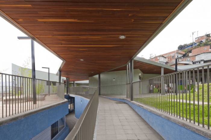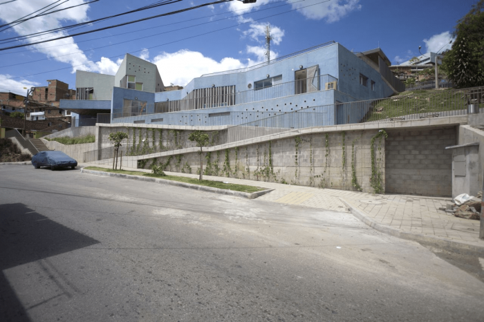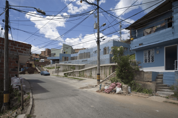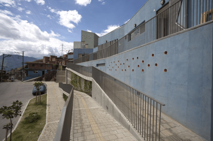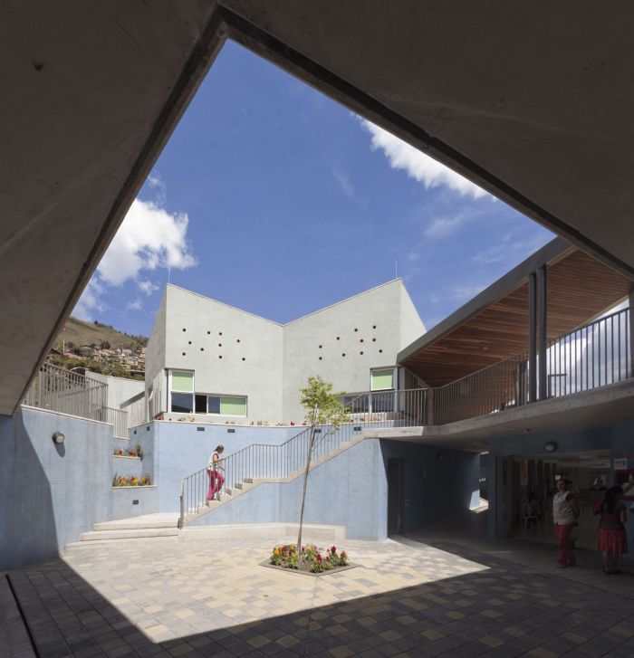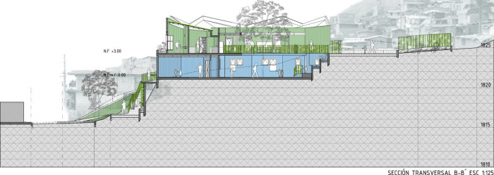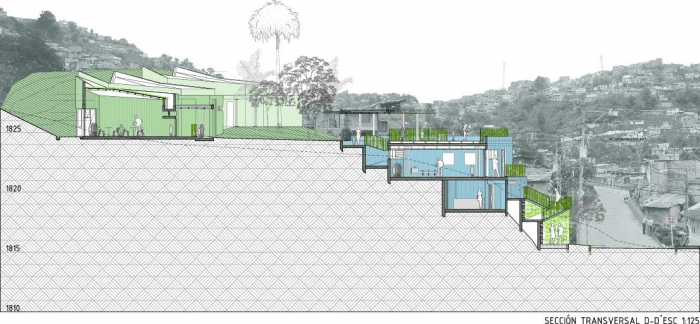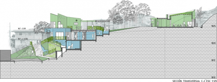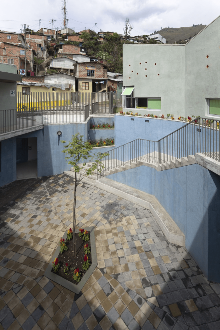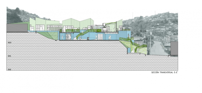 Buildings at the Santo Domingo Quarter are typically self-construction homes in red brick and concrete flat roofs, which allow vertical growth over time. These buildings gradually grow in height and shift their reddish appearance by plaster and paint of different colors that inhabitants enjoy and understand as higher-quality buildings. Given this scenario, we wanted the project to bring to evidence the changes in height, staggering, and the quarter’s geometrical irregularity and diversity, as well as its washed granite finishing in shades of green and blue, seeking that the new infrastructure be readily recognized and at the same time that would organically articulate to the life of the quarter.
