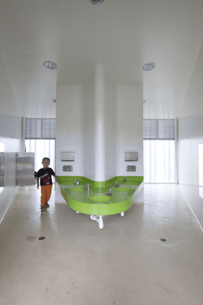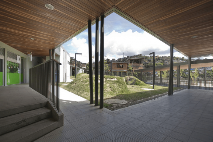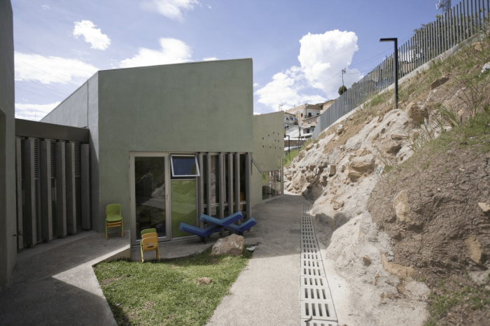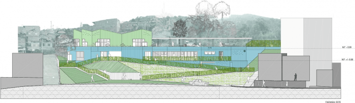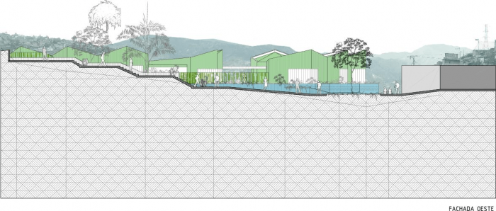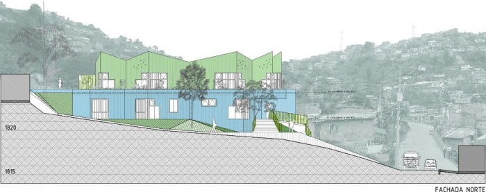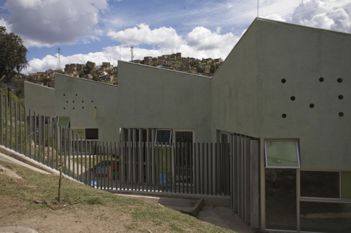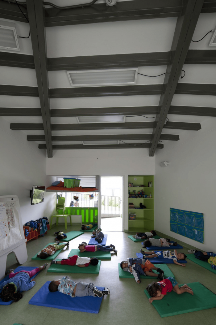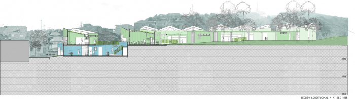 Set on a steep (22%), and rocky slope, this project chose a modular approach that could adapt to the topography without the use of expensive dynamite to break the existing rocks. For this reason, the project is assembled in two levels that connect through covered ramps. The kindergarten articulates with the neighborhood by seeking to avoid the demolition of existing buildings and by adhering to strict distance and withdrawal regulations.