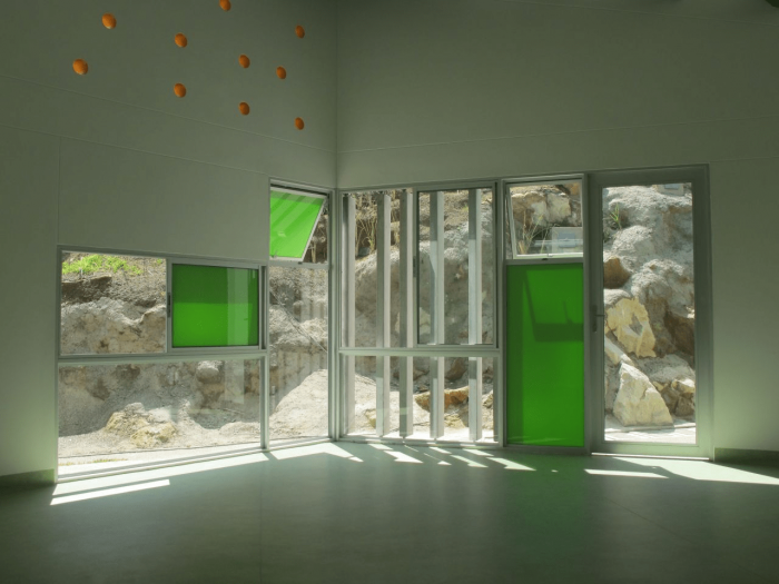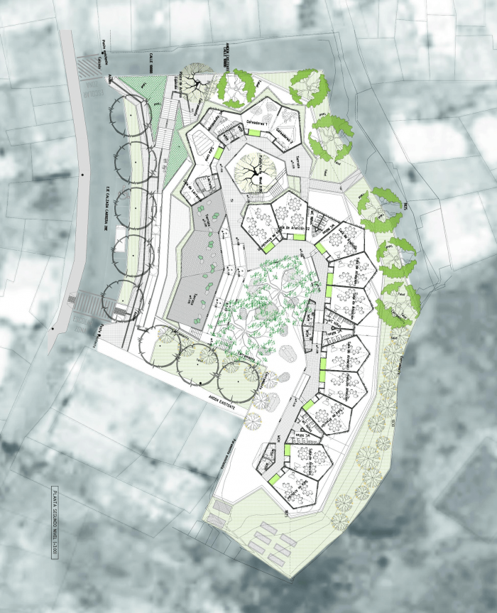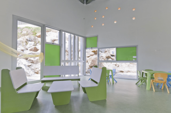 该项目设置在一个陡峭(22%)的岩石坡上,该项目选择了一种模块化的方法,可以适应地形,而不需要使用昂贵的炸药来打破现有的岩石。出于这个原因,该项目被组装成两层,通过有盖的坡道连接。幼儿园通过寻求避免拆除现有建筑和遵守严格的距离和撤离规定,与周边环境相衔接。
