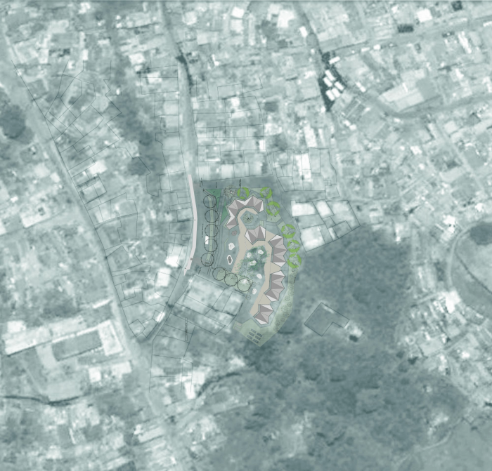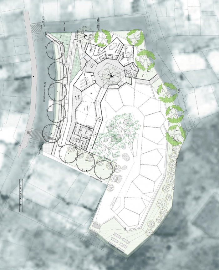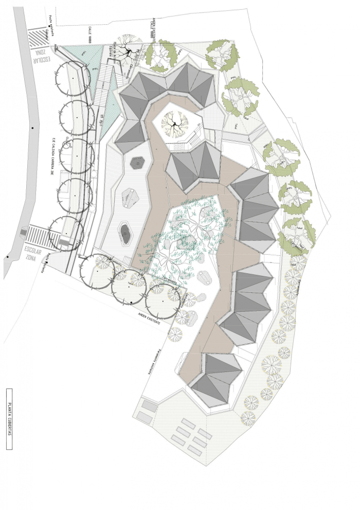 圣多明各区的建筑通常是红砖和混凝土平顶的自建房,允许随着时间的推移垂直增长。这些建筑的高度逐渐增长,并通过不同颜色的石膏和油漆来转变其红色的外观,居民们喜欢并理解为更高质量的建筑。鉴于这种情况,我们希望该项目能够证明高度的变化、交错、该区的几何不规则性和多样性,以及其绿色和蓝色色调的水洗花岗岩饰面,寻求新的基础设施被容易识别,同时,将有机地衔接到该区的生活。