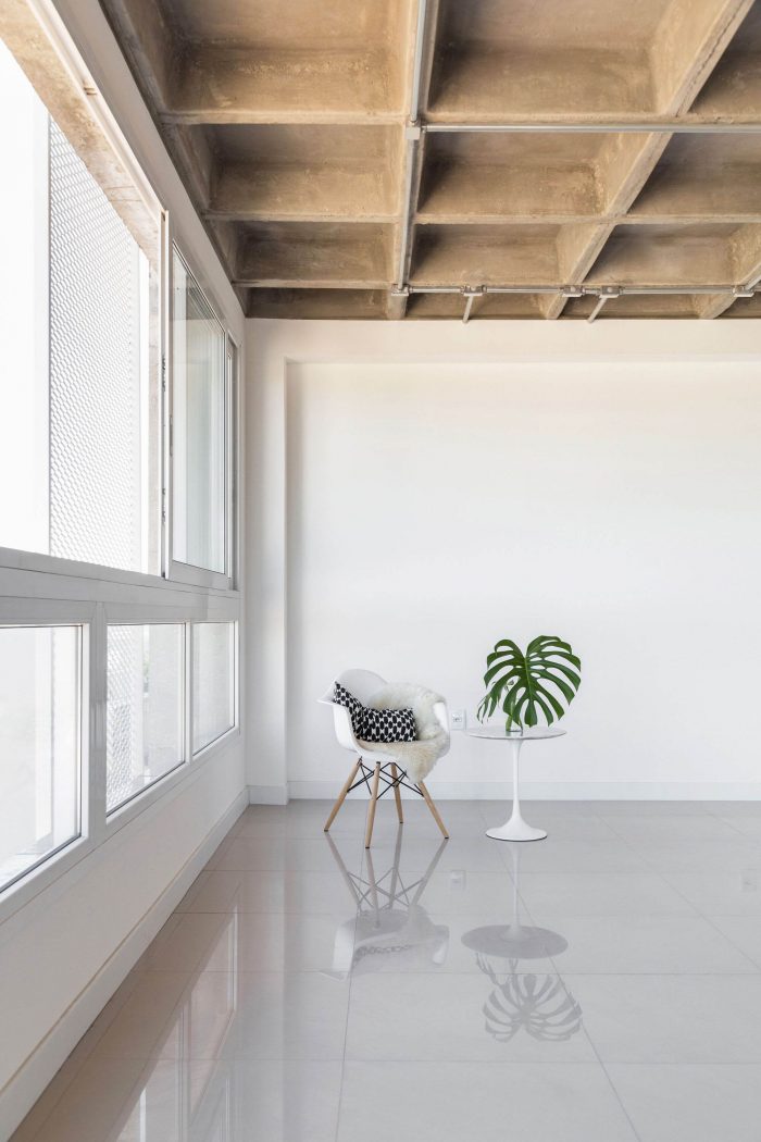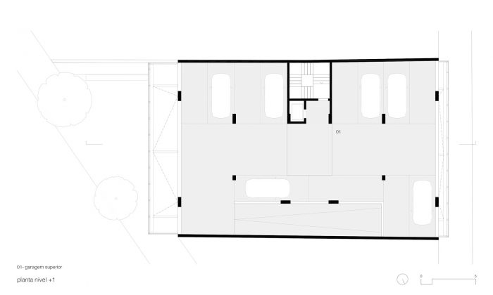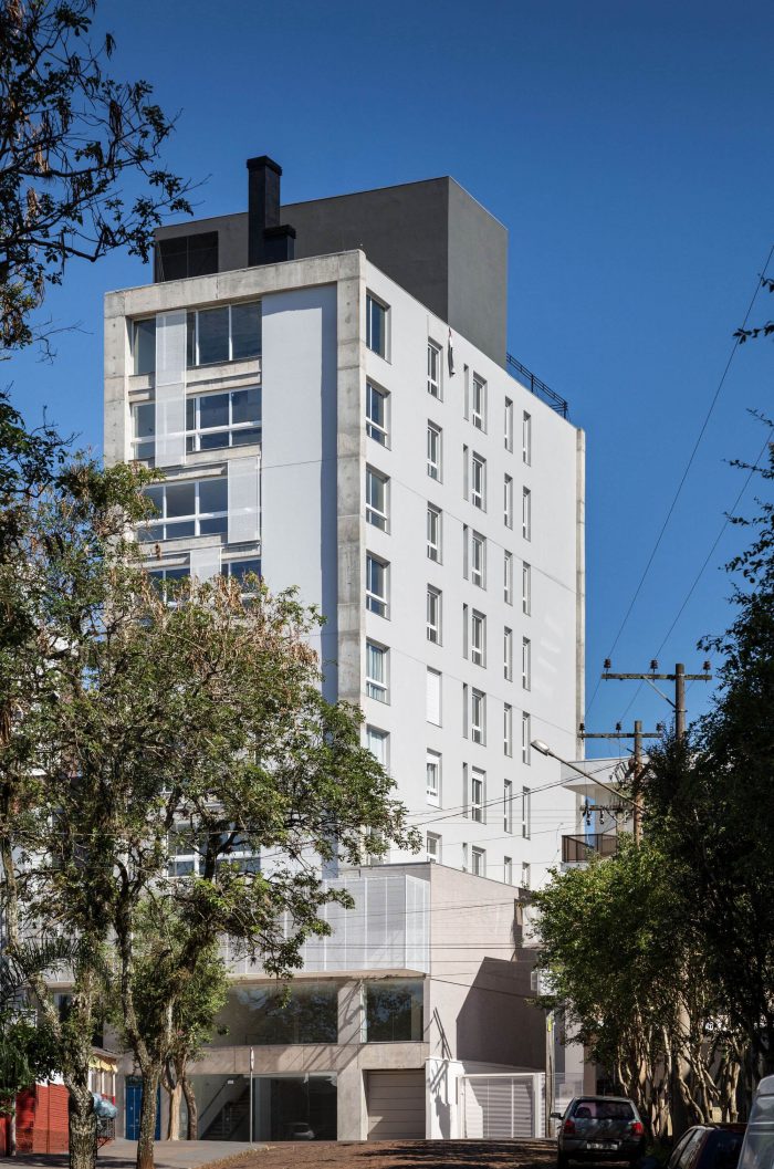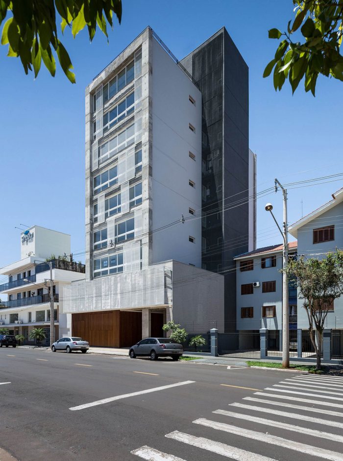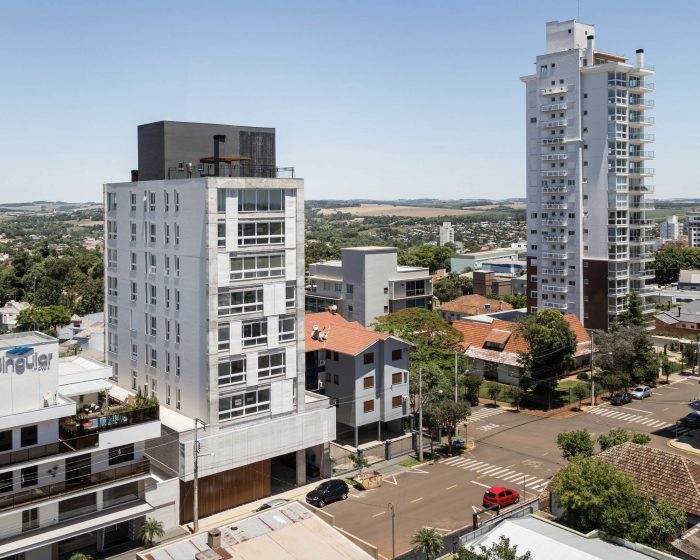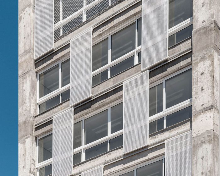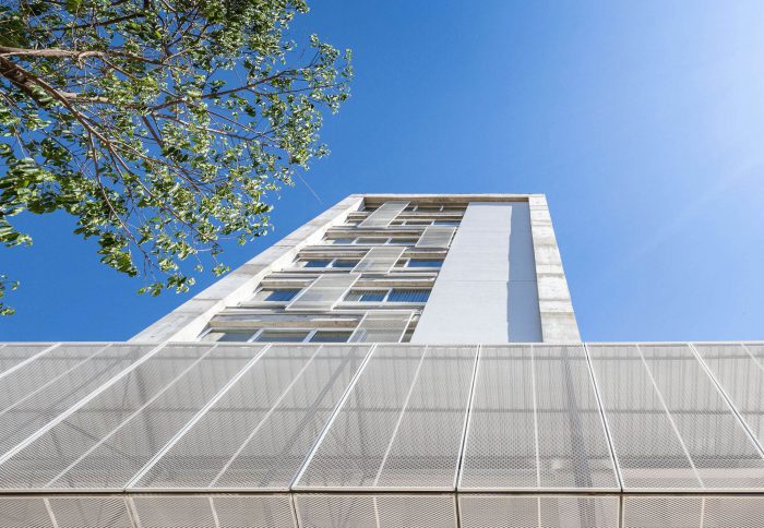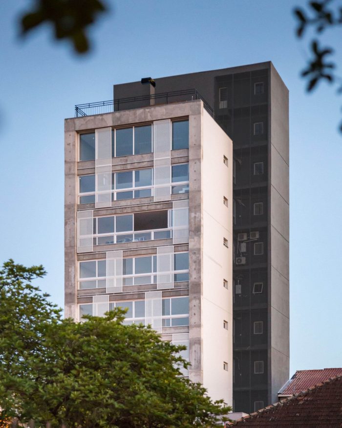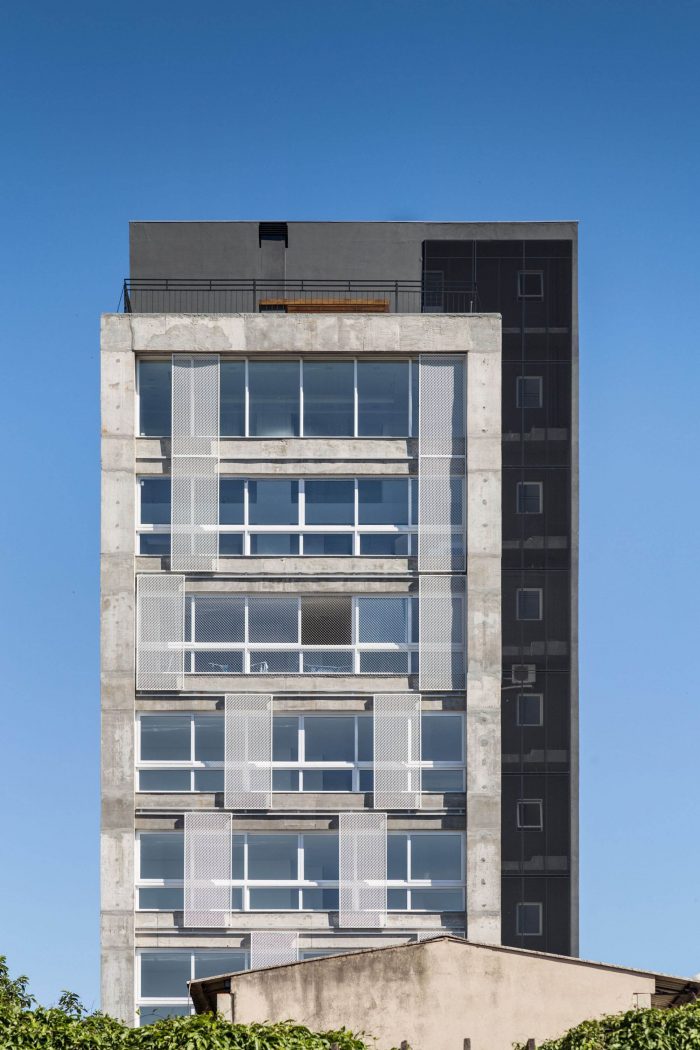 That made possible the creation of wider and more flexible spaces for living and bedrooms, whose distribution can be changed over time. The structure with four powerful columns on the tower’s corners allows windows to grow wide on the façade – where views of the city penetrate through the sliding louvers of expanded metal. A terrace was created on top of the building, so that the building could also become a small community, gathered to watch as the sun hides behind a horizon of soybean fields.