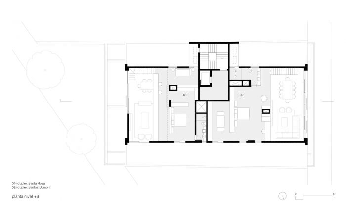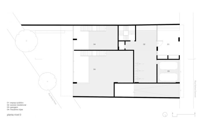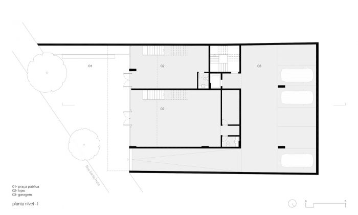 We decided to use the site’s irregular shape and the fact that it had two open sides – facing different streets – to concentrate the mass of the building on its northern portion in such a way to generate space for a small public square on its southern edge. The level difference between the streets allowed us to create two commercial shops on the base of the building, accessed directly from the square, attracting people and creating a node of vitality. As an outcome, we managed to break the narrow and continuously neutral experience along the sidewalk, usually blocked by fences and walls along the street. The square’s expanded space is meant to become a place for people to meet under the shadow of the native trees, an open-air living room for city life.