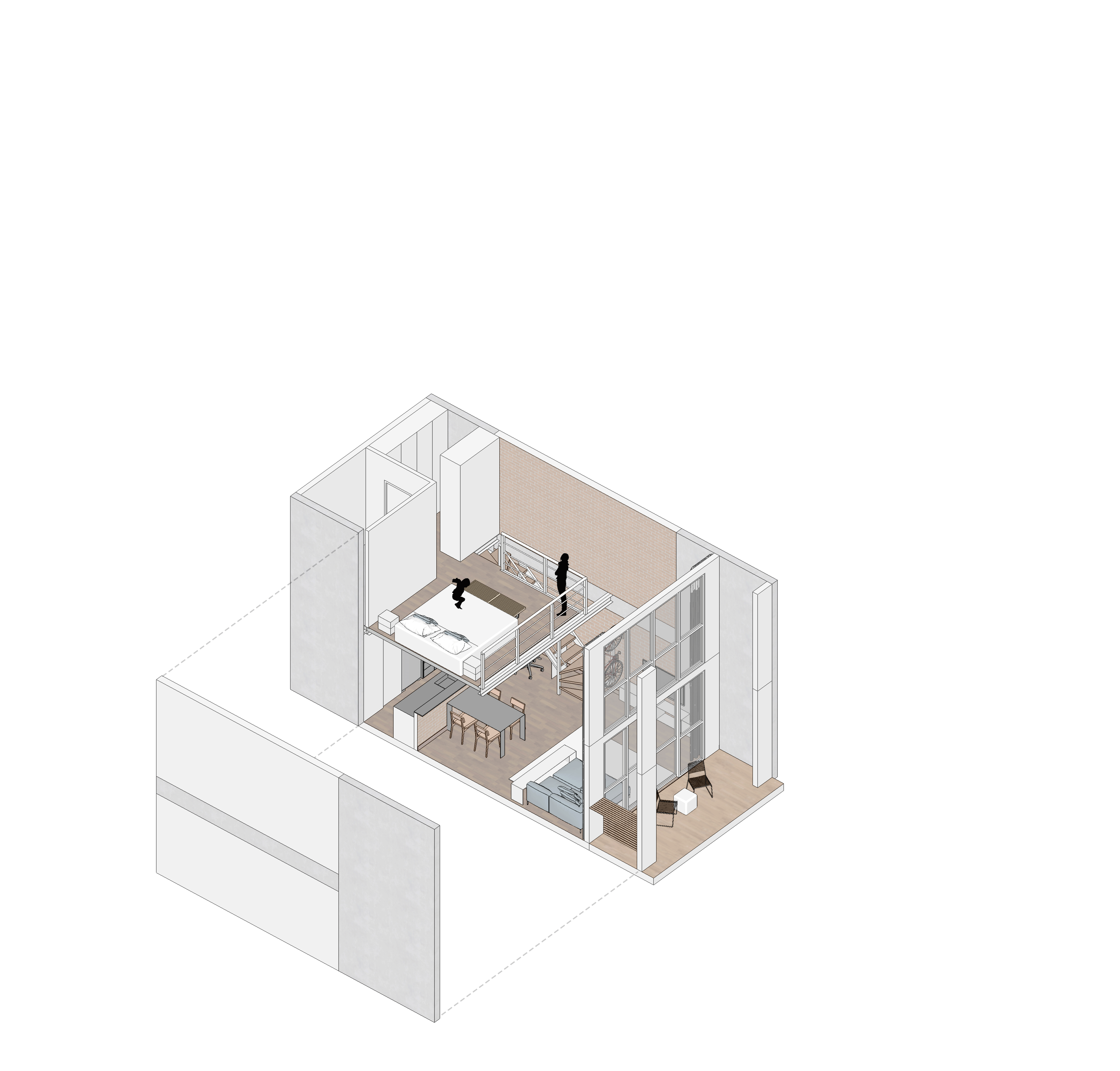 公寓的入口处有一条小走廊,限制了它的使用,因此,我们设计了一个架子,它可以通过个人物品传递住户的个性,同时也是日常使用物品的组织者。同样的架子从梯子上往下推进,它们(架子和梯子)共同创造了一个更加个人化的空间,以便于集中精力和工作,这也是客户的简报所要求的。
