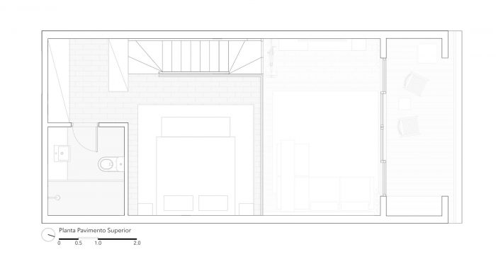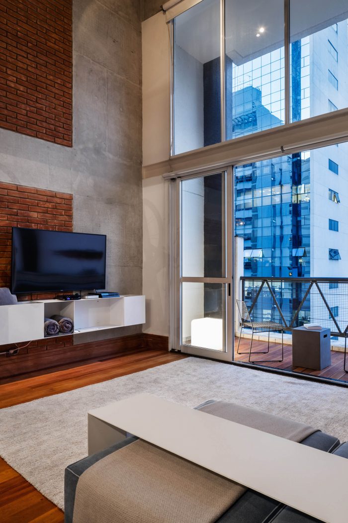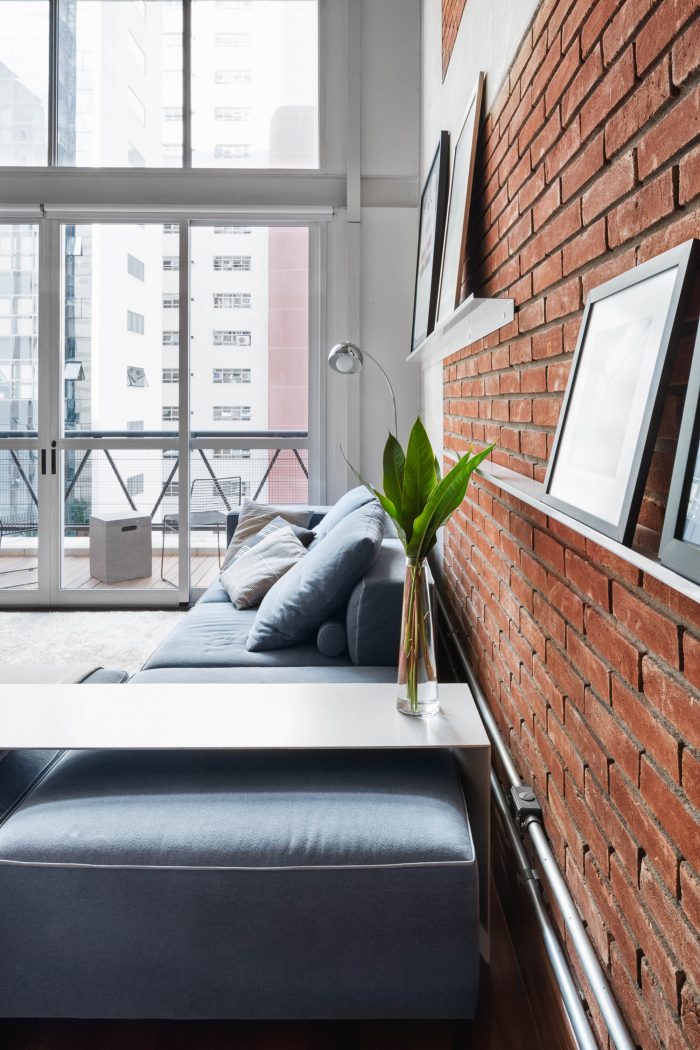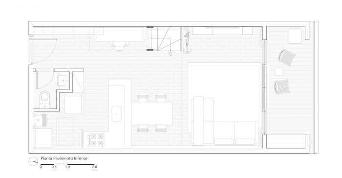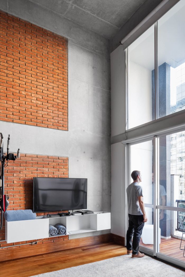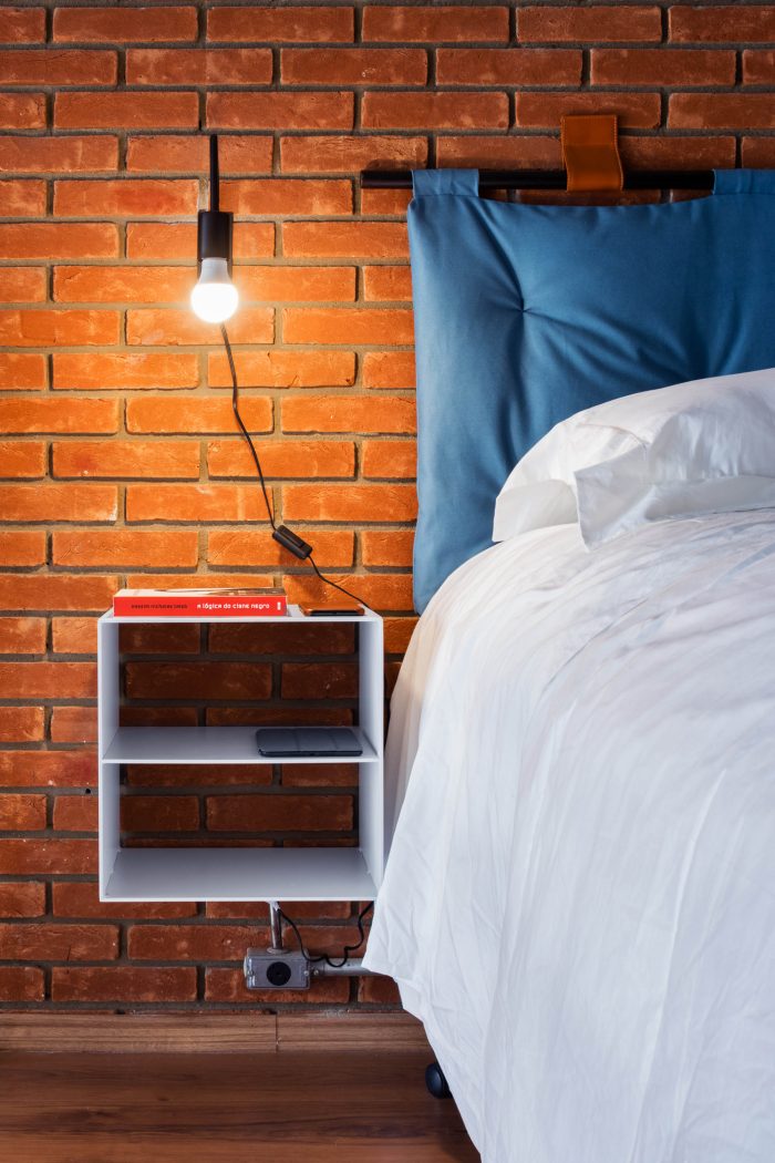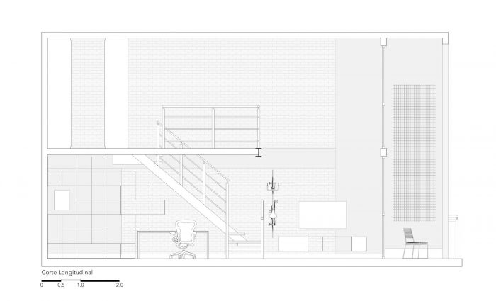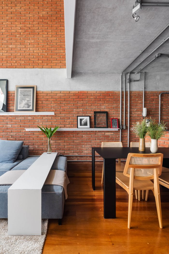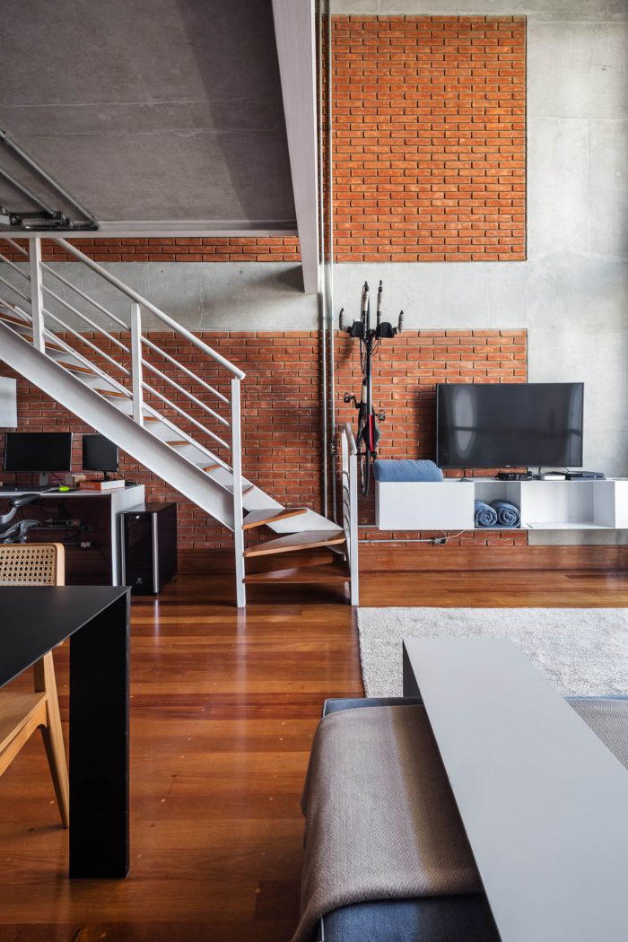 The balcony should help with meetings, containing more chairs and tables that could serve as a seat and that could easily be moved to the living room on feast days. The materiality of the walls and structure was maintained unfinished, as well as the lighting ducts highlighted by the apparent bricks, keeping the young and despoiled atmosphere desired from the start.