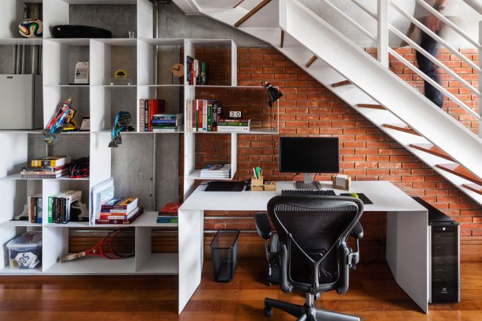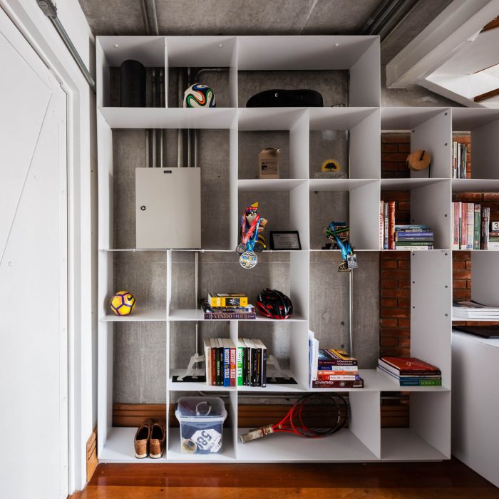 The access of the apartment is marked by a small corridor that limited its use, with that, was designed a shelf that could transmit the personality of the resident through personal objects and also be an organizer of objects of daily use. This same shelf advances down the ladder, and together (shelf and ladder), they create a more personal space for concentration and work, as requested by the client's briefing.