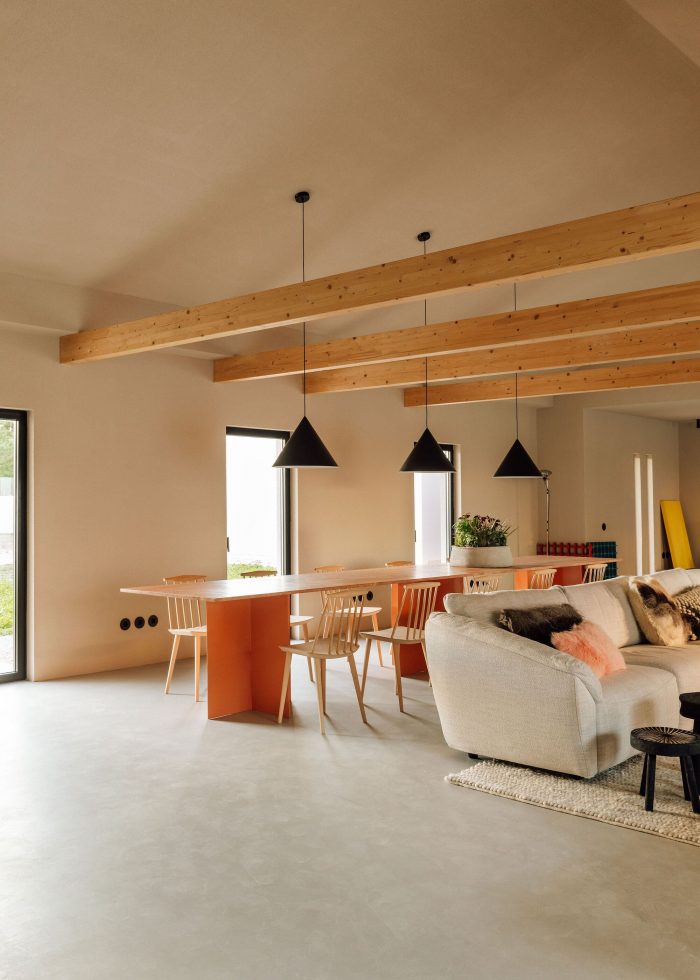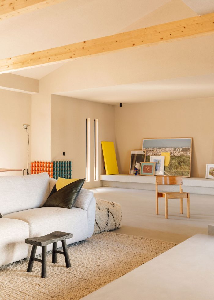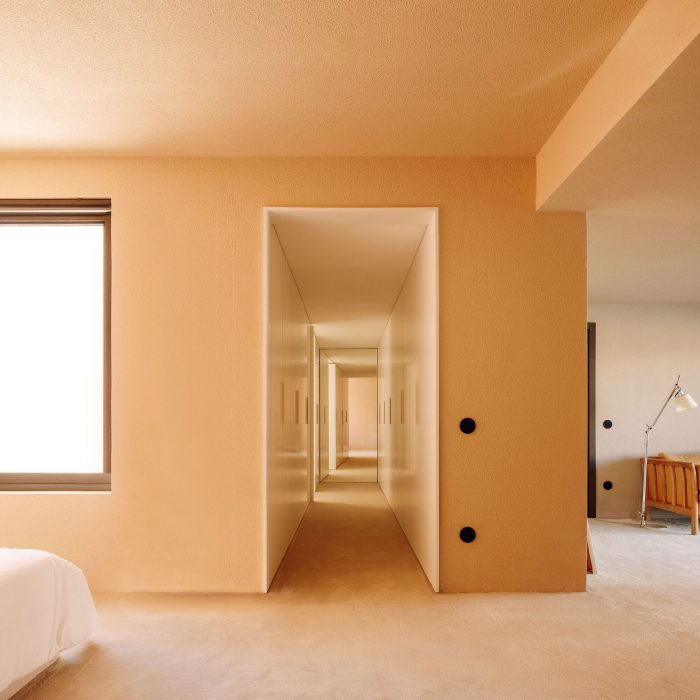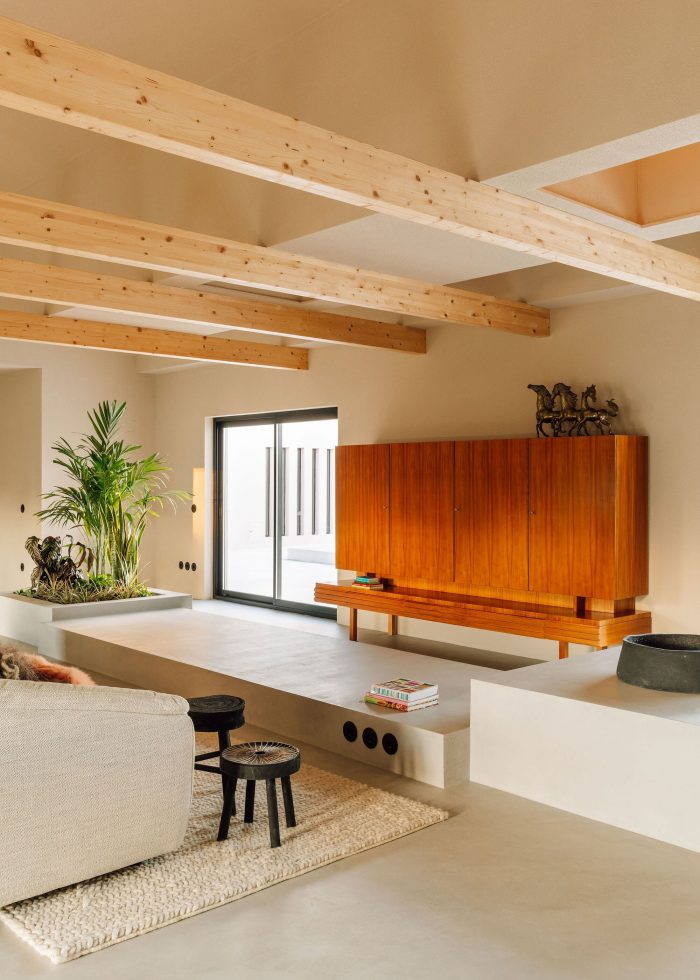 Inside, the use of continuous textured coatings, such as the beige and white of the walls or the cement on the floor match the logic used for the exterior surfaces. This helps to confer a uniformity on the whole, while offering a welcoming and immersive experience of the various spaces.