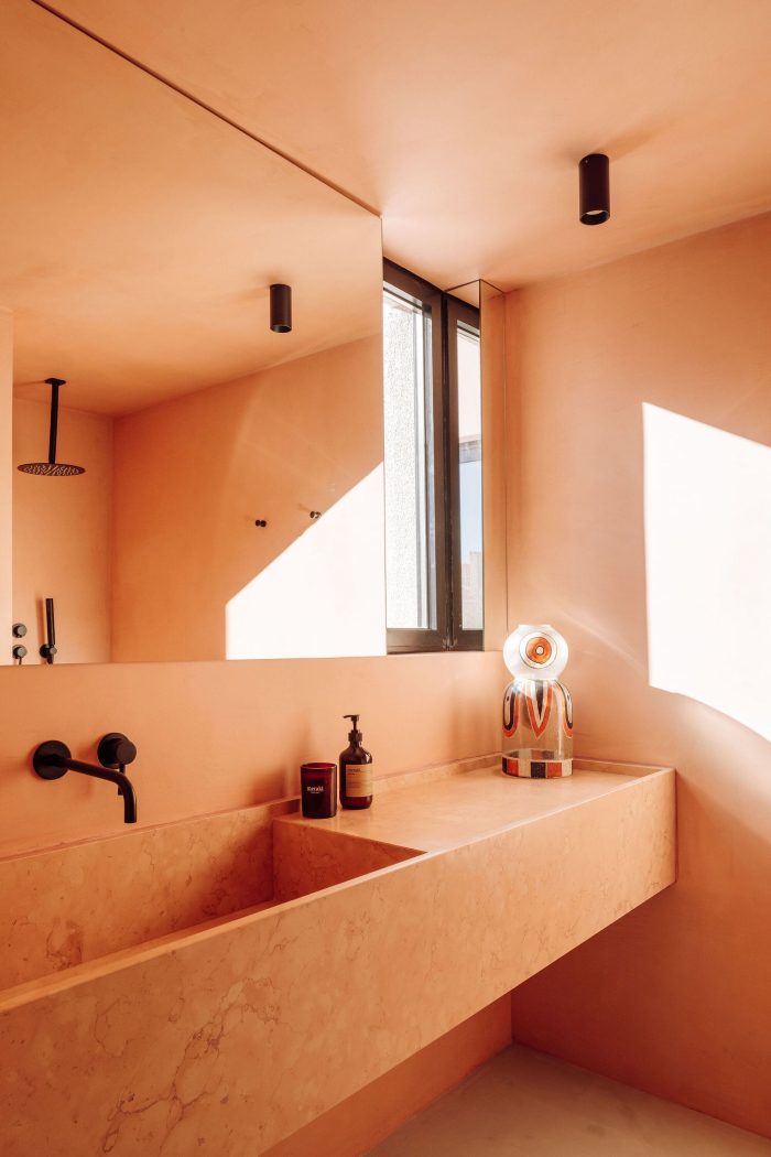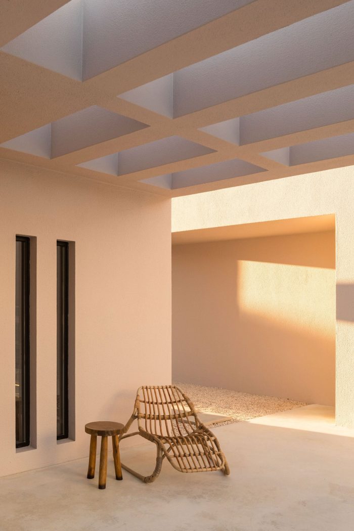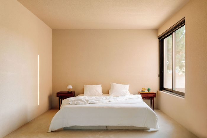 在房子的私人部分,南边的小天井让光线进入卧室和厕所。每个厕所都使用了不同的颜色,而天然石材的洗脸盆则以完全相同的色调作为点缀。值得注意的是,主人套房结合了生活和工作区,靠近游泳池,有一个长长的白色更衣室,包括通往独立厕所和淋浴区的不同通道。