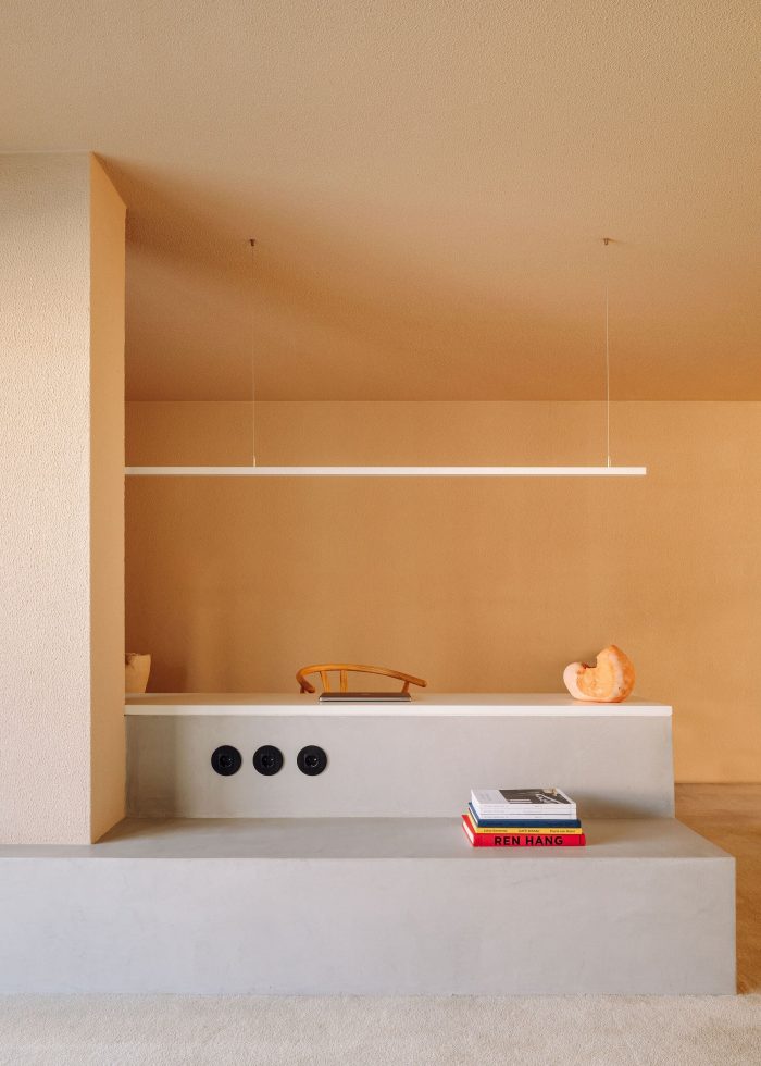 天花板上的木梁为空间提供了一个更温馨的尺度,并支撑着引入自然光的天窗。在天窗下面,一个不同层次的混凝土平台上,整合了一个坐位、一张长条咖啡桌和一个植物盆,为空间带来了一丝自然植被--这一特点也为房间的纵向组织奠定了基础,只需一个简单的姿态。还设计了一张天然红色洞石的大桌子,再次确认了空间的比例。