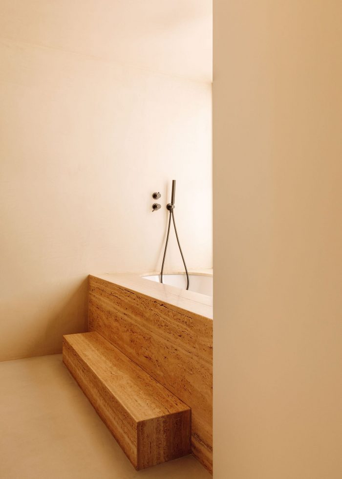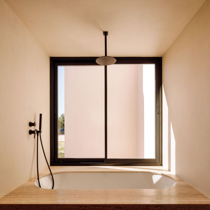 In the private wing of the house, the small patios to the south let light into the bedrooms and toilets. Each toilet is marked by the use of a different color, punctuated by the natural stone washbasins combined in exactly the same shade. The master suite is notable for combining a living and working area, in close proximity to the swimming pool, with a long white dressing room that includes dissimulated access to the separate toilet and shower area.