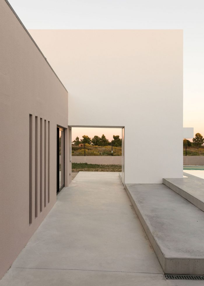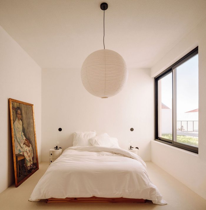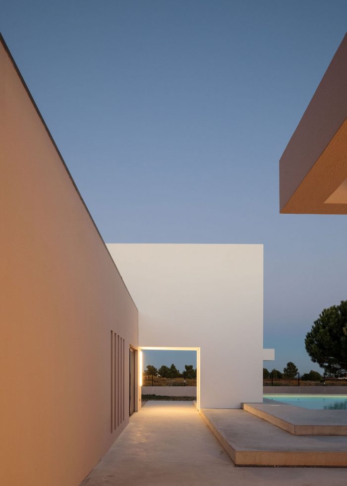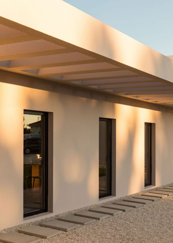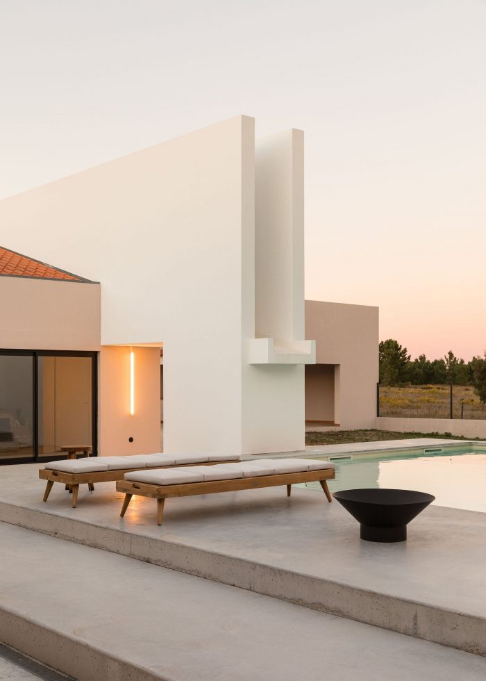 On the outside, all secondary elements, such as low walls and paved walkways were eliminated, the openings were redesigned and the exterior flat surfaces were painted in textured shades of beige and white for explicit identification of the different volumetric structures. The existing water mirror was transformed into a swimming pool and by manipulating the patio’s pavement levels, new platforms were created to allow different types of appropriations of the outdoor space.