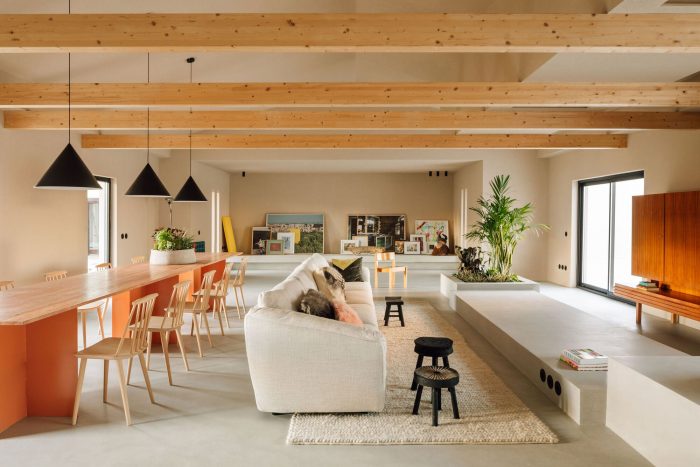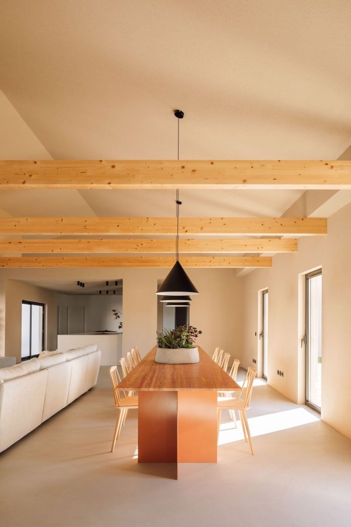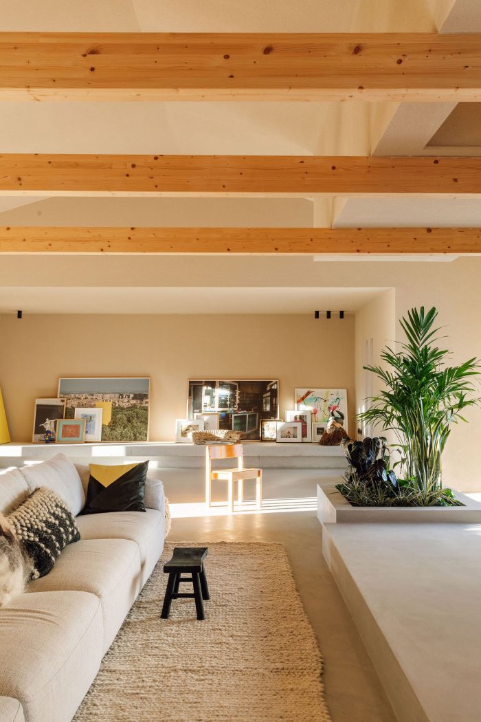 The wooden beams on the ceiling provide a more welcoming scale to the space and support the skylights that bring in the natural light. Below the skylights, a concrete platform with different levels incorporates a sitting area, a long coffee table, and a plant pot to bring a touch of natural vegetation to the space - this feature also sets up the longitudinal organization of the room, in one simple gesture. A large table in natural red travertine stone was also designed, reaffirming the proportion of the space.