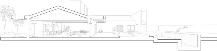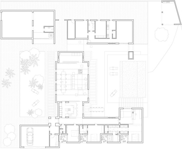 在内部,空间的组织通常被保持。入口在西侧,在一个将社交区域和私人区域分开的位置。一个开放的厨房被安置在建筑的中心,与房子的私人和社会部分、外部和游泳池的关系都很好。它是一个功能性的过渡区,提供通往客厅的通道。这个主要的社交区域是慷慨的,是房子的高贵空间,值得注意的是它的高天花板和与外部的易渗透性。