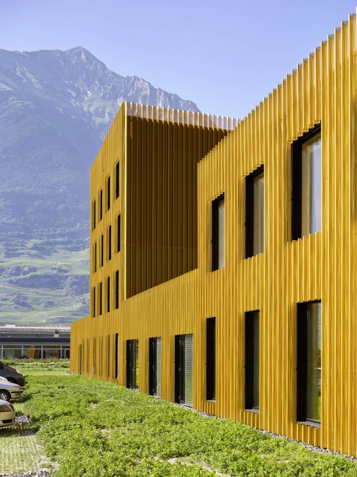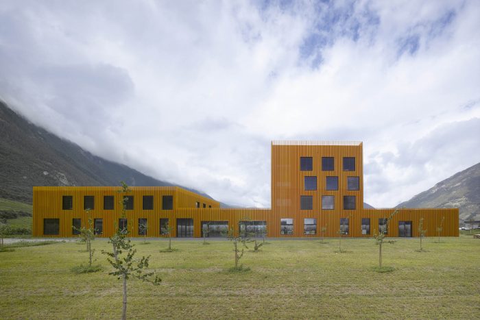 This facility, a residential, occupational, and healthcare center for persons with psychological, somatic, or social issues or issues arising from addiction, aims to offer its clients a contained, structured environment while they prepare for their reintegration into the community. Located amongst the orchards in the Rhone valley, halfway between the villages of Saxon and Charrat, the new facility is anchored in the rural structure of the locality. The way the orchards, fields, and vineyards are arranged dictated the design of the building and its surroundings. The building is incorporated within this orthogonal logic.