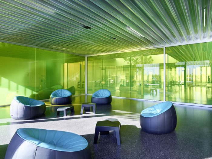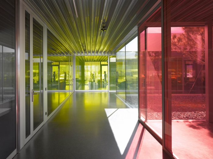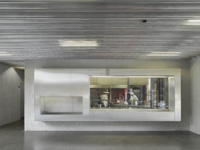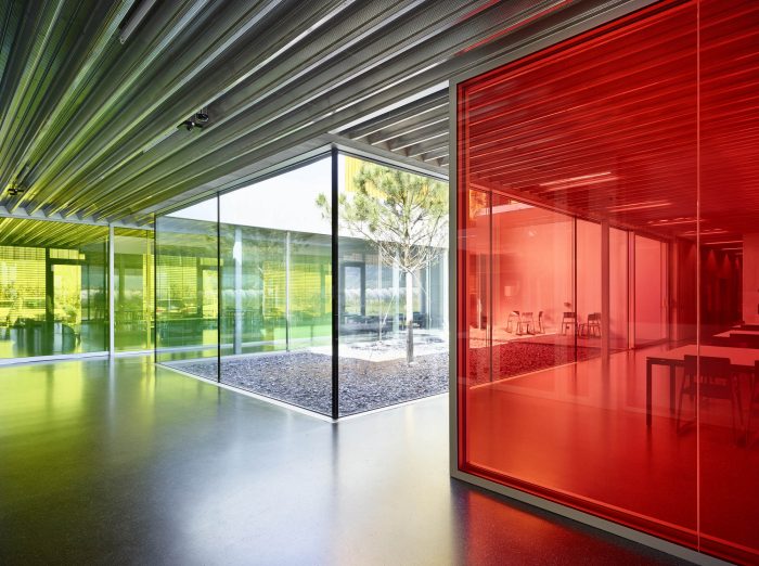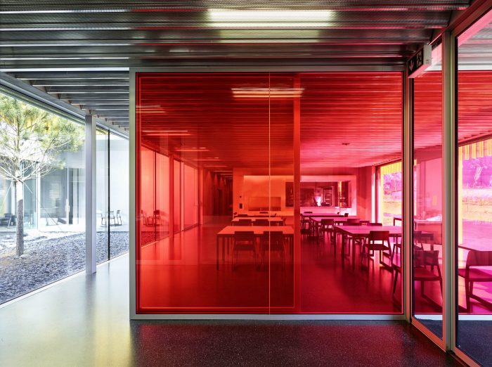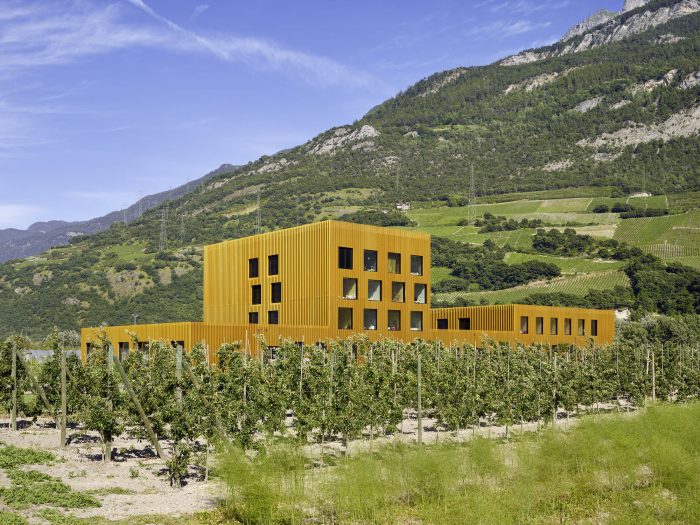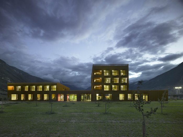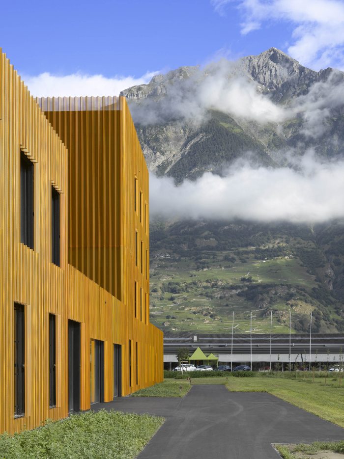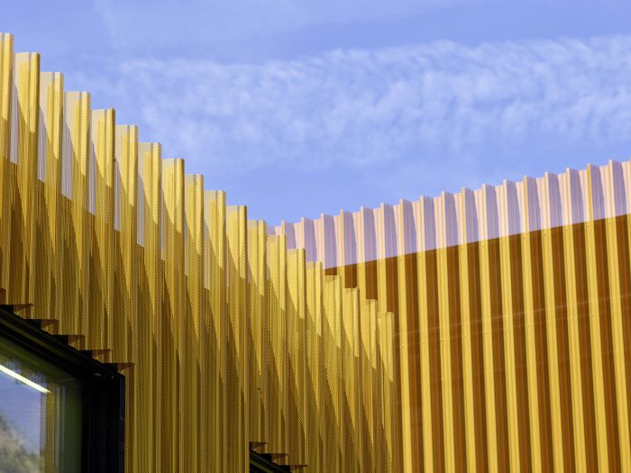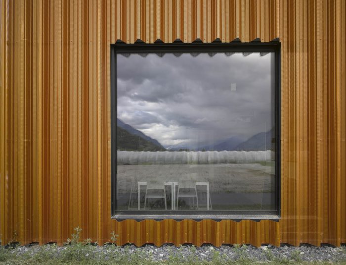 The large windows in the façade create a regular rhythm. The opening part of the window is protected by the perforated metallic skin with which the façade is clad. The opening part swaps position from one floor to another, creating a staggering effect in the window piercings – an effect that disappears at night when the lights are on. The deep ribbing of the cladding and its copper hue imbues the facility with an identity all its own. The use of industrial metal is a nod to the fruit hangar in the valley.