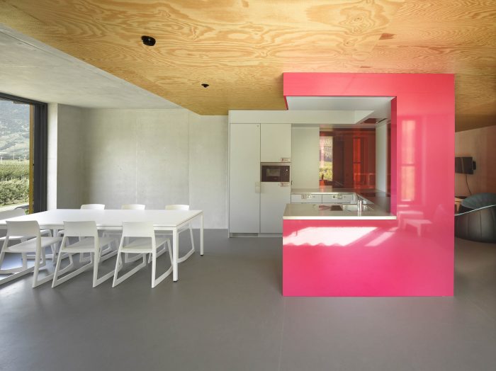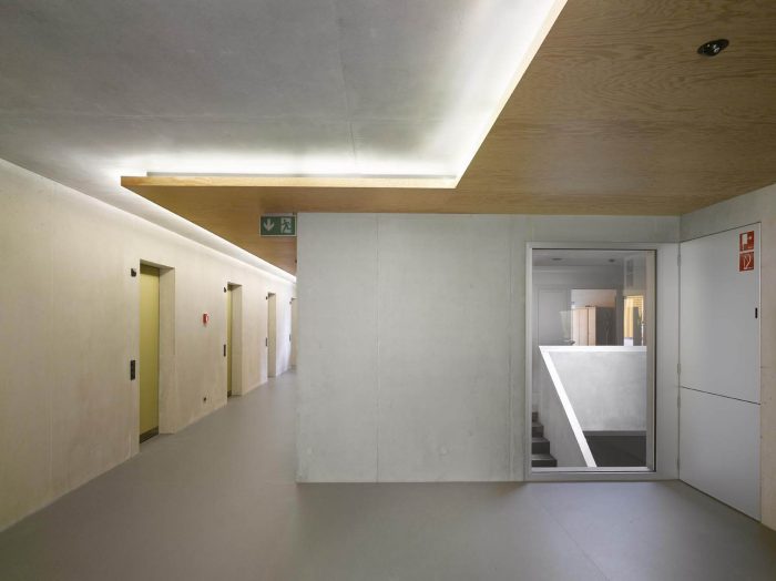 The interior materiality is rigorous: visible concrete walls, smoothed asphalt floors, and metallic false ceilings featuring large ribs. The use of laminated pine panels for the false ceilings and wall cladding imbues the apartments with a domestic atmosphere, while the tinted glazing brings colored light into the common spaces. The various spaces are open towards the valley for the enjoyment of the most interesting views and to take advantage of the morning and evening sun.