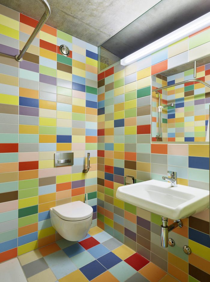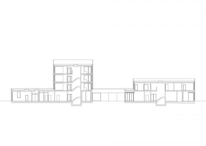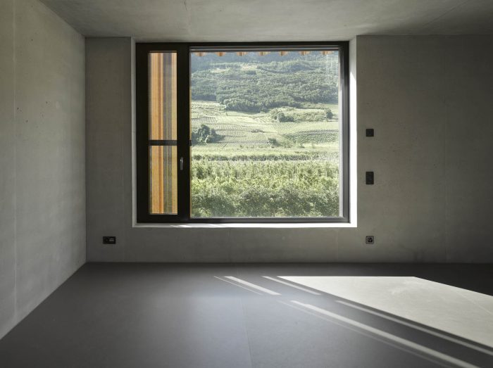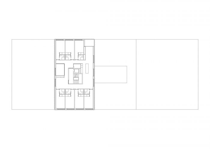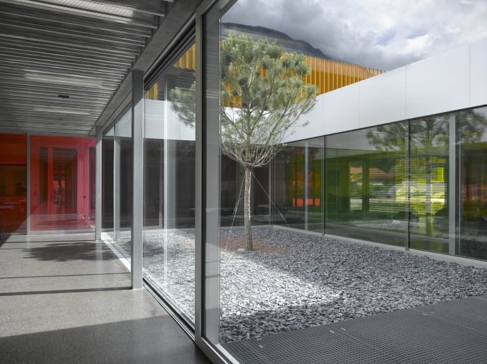 The entrance to the facility and interior patio is positioned in such a way as to protect the residents from the prevailing wind which ascends the valley. The residential spaces are on the upper floors – arranged horizontally for persons with urgent social needs and short-stay residents, and vertically for the three long-stay apartments. Thus the two types of stay are naturally separated and clearly identifiable. The residential units function like large autonomous apartments with bedrooms and an open-plan kitchen, diner, and lounge area with an enclosed balcony extension.