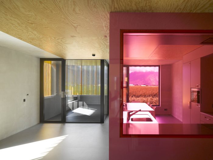室内的材料是严格的:可见的混凝土墙,光滑的沥青地板,以及具有大肋骨的金属假天花板。在假天花板和墙面上使用层压松木板,使公寓充满了家庭氛围,而有色玻璃将彩色光线引入公共空间。各个空间都向山谷开放,以享受最有趣的景色,并利用早晨和傍晚的阳光。