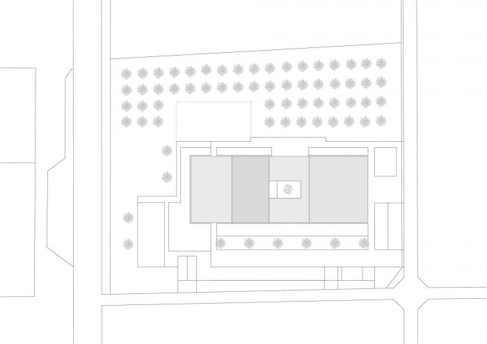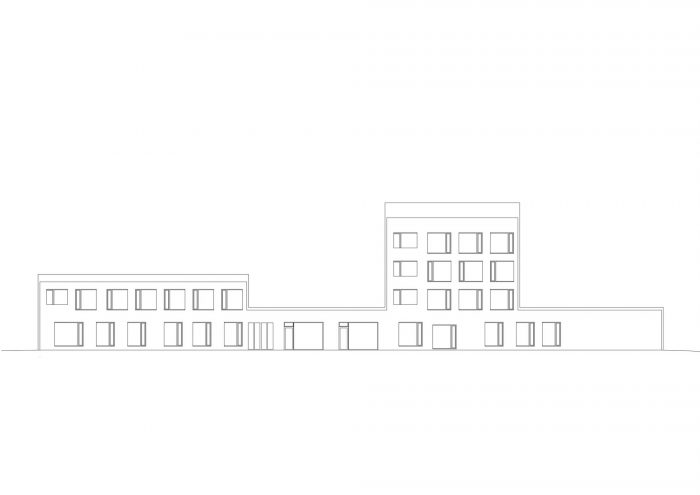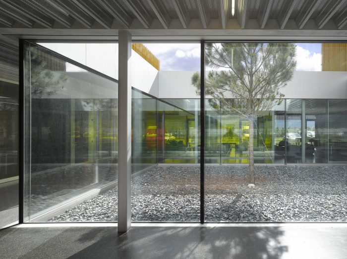 The project gathers the various functions under one roof, the dissected composition of volumes identifying the various sectors. Forming a large pedestal, the ground floor houses the common functions on either side of the central patio, the heart of the facility around which articulate the reception/meeting, dining and recreational spaces – a place for socializing that is open, contained, and convivial. The south wing contains the administrative offices and the healthcare and stewardship functions, while the north wing houses the occupational workshops.