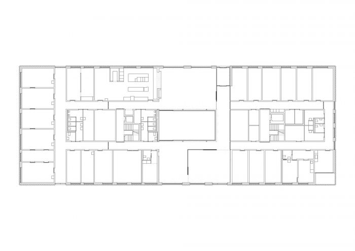 该项目将各种功能聚集在一个屋檐下,体量的剖分构成确定了各个部门。地面层形成了一个大的基座,在中央天井的两侧容纳了公共功能,天井是设施的核心,围绕天井衔接了接待/会议、餐饮和娱乐空间--一个开放、包容和欢快的社交场所。南翼包含行政办公室、保健和管理功能,而北翼则是职业工作室。