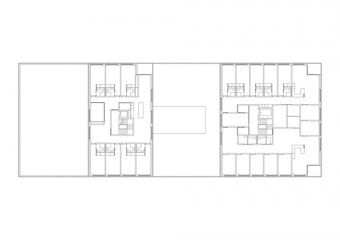 该设施的入口和内部天井的位置是为了保护居民不受山谷中盛行风的影响。住宅空间位于上层--横向排列的是有紧急社会需求的人和短期居住者,纵向排列的是三个长期居住的公寓。因此,这两种类型的住宿是自然分开的,并且可以清楚地识别。住宅单元的功能就像大型的独立公寓,有卧室和一个开放式的厨房、餐厅和休息区,还有一个封闭的阳台。