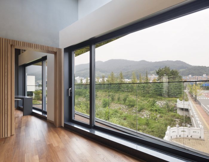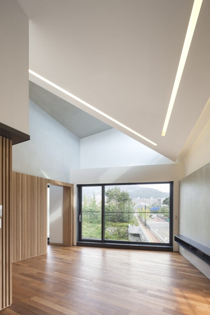 The height of the roof was different, so the lights came in from various angles from the east, south, and the west. It became possible to feel the seasonal changes inside the building thanks to the natural lights coming from the windows. This is the optical space organization that can overcome the physical weakness of the north side and get the maximal sun lights. Moreover, the automatic upper windows discharged the heat inside to outside in summer, making the cross ventilation possible with the windows and doors in the south and north. This project design was based on the natural convection current to make an eco-friendly and heat-effective space.
