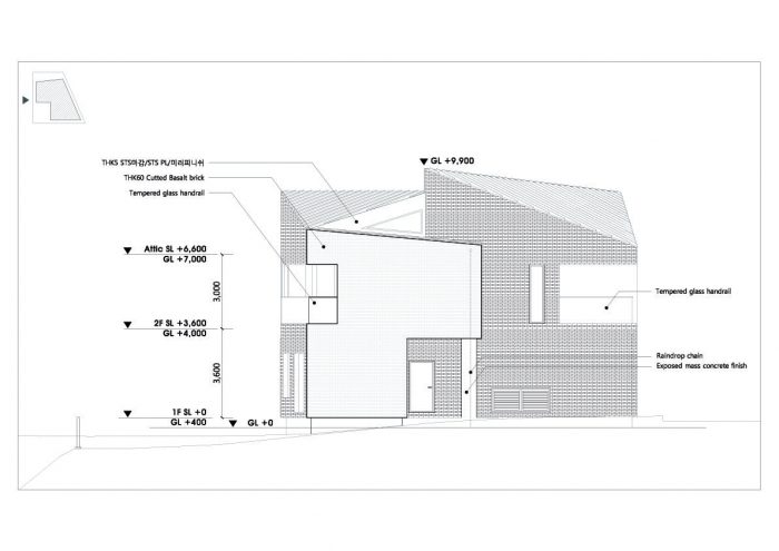 The 2-parted basalt bricks are recomposed with the general bricks and changes both the vertical and horizontal form with the embossed and engraved parts. The changes are caused from the features of the bricks as the material presents the changes of strata in contrast. The rough pores of the basalt gives us an essential message of the materials inside the recomposed surface. The bricks are revealing their existence by the recomposed forms with the embossing and engraving that changes the angles of the light. The materials are recomposed and the image is re-structured.