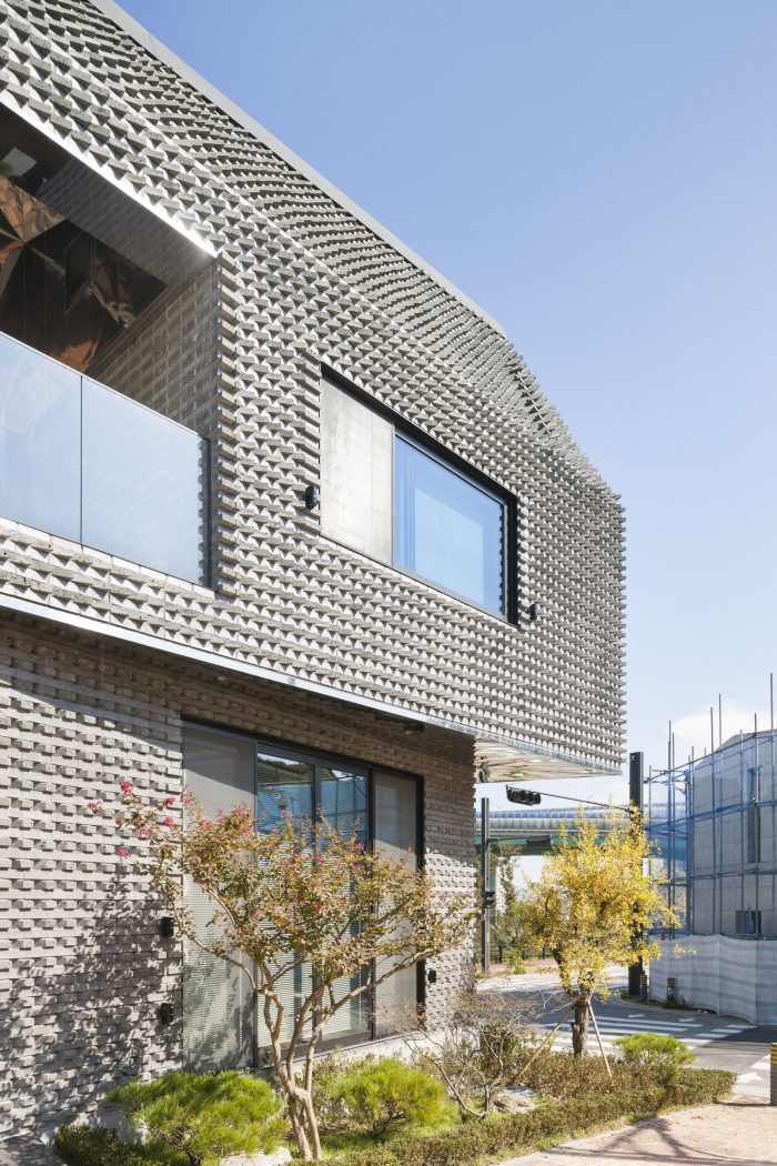 The recomposition of materials- Cold, warm and neutral matter properties. The architectural form consists of basalt bricks, general brick, and stainless steel. As well as general brick, about 20,000 basalt bricks, which are the main material to compose the rough surface, are divided into two parts according to their angles and recomposed on the architectural form. The basalt bricks are allocated horizontally in five parts ranging from 5 degrees to 45 degrees. In addition, it is divided into the embossed and the engraved parts vertically.