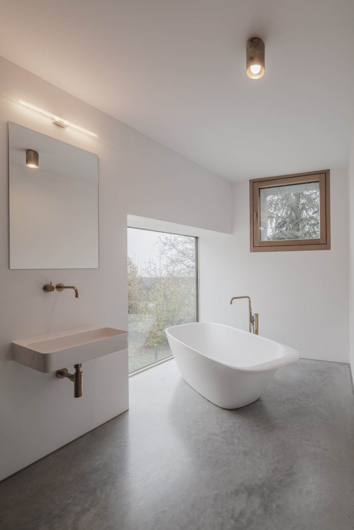 During the planning phase, the use of natural, solid and untreated materials was crucial. The interplay of raw brass, untreated oak and plastered surfaces can be found in many details. Ceiling lamps and furnishing have specifically been designed to fit the architecture.