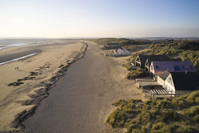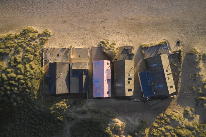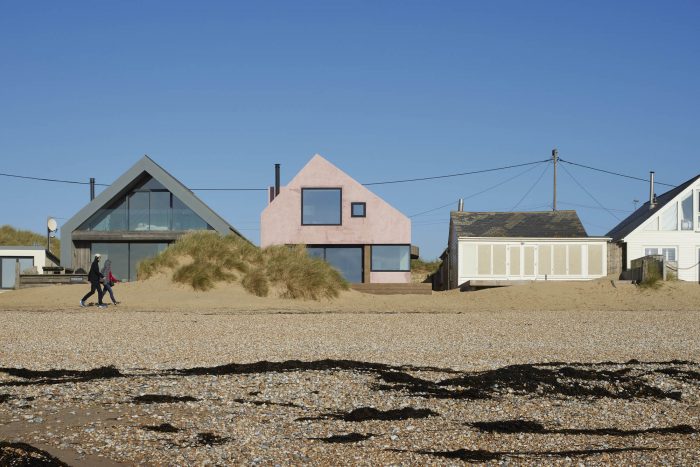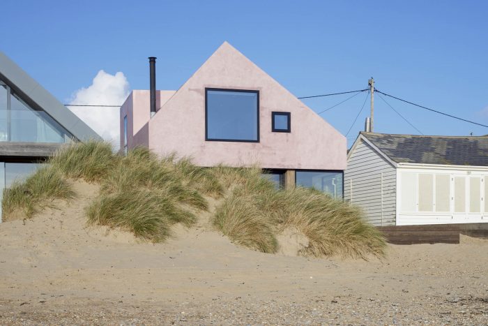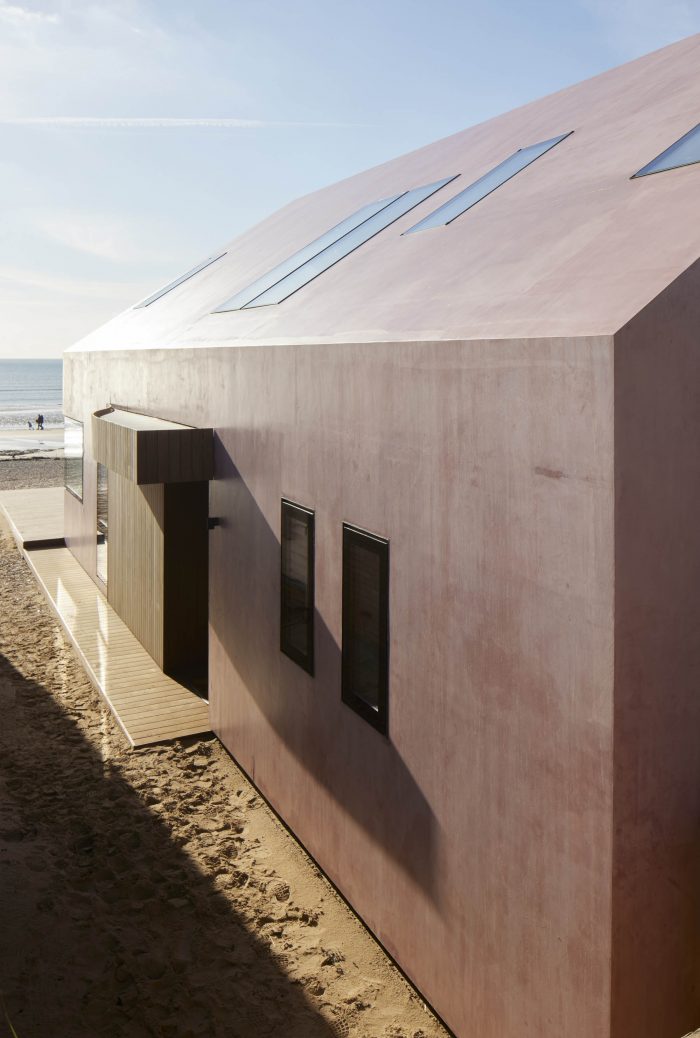 In terms of more project design-related issues - The dune formations behind the property are a unique landscape feature and are designated as an SSSI, also attracting migrating birds. The designs are focused on creating a robust building to cope with the extreme weather conditions, with high winds, moving sand, and salt air. The building has been externally finished in trowelled micro fibre cement with a pink pigment, to create a sealed external envelope. The external material selection was carefully considered to be robust and strong, however, the pink pigment in the finish softens the visual impact and sets the building off against the dramatic and ever-changing backdrop of the sky and beach.