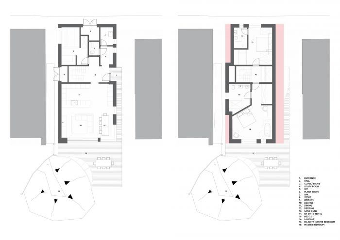 就更多与项目设计有关的问题而言--该物业后面的沙丘结构是一个独特的景观特征,被指定为SSSI,也吸引着迁徙的鸟类。设计的重点是创造一个坚固的建筑,以应对极端的天气条件,包括大风、移动的沙子和咸空气。建筑物外部用粉红色颜料涂抹微纤维水泥,以创造一个密封的外部围护结构。外部材料的选择是经过深思熟虑的,以保证其坚固性和强度,然而,粉红色的颜料在表面处理中软化了视觉效果,并将建筑与天空和海滩的戏剧性和不断变化的背景相衬托。