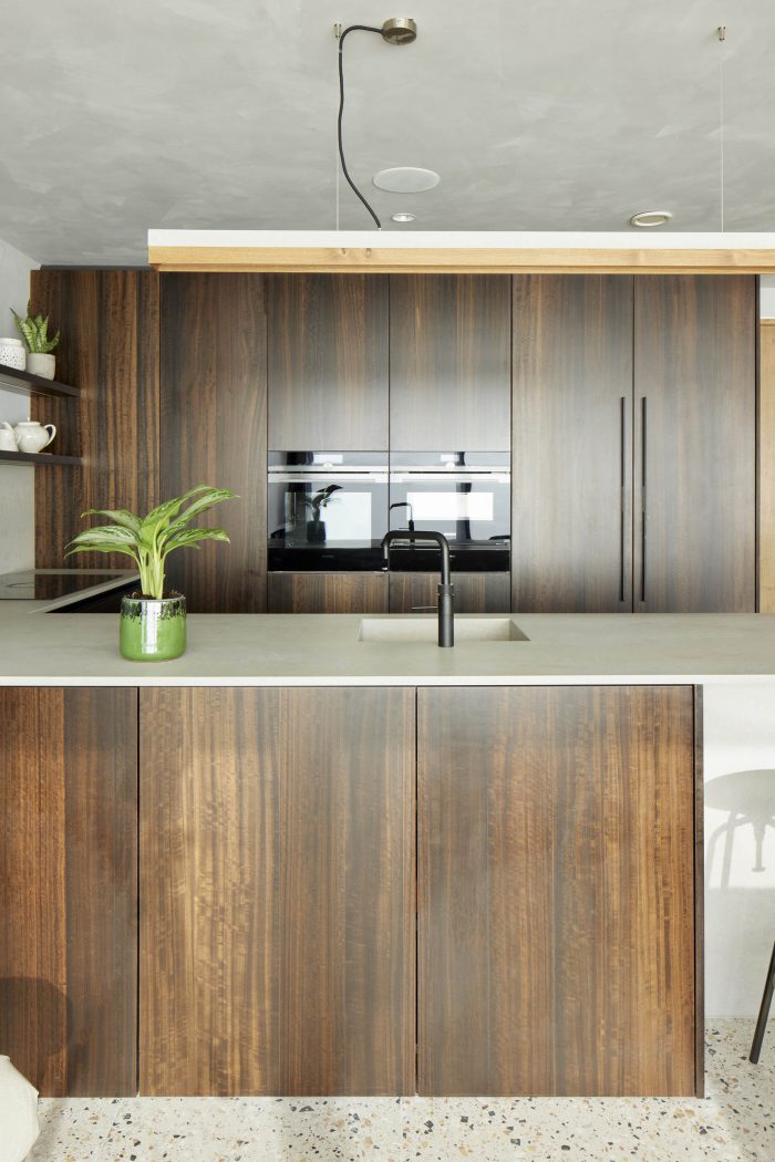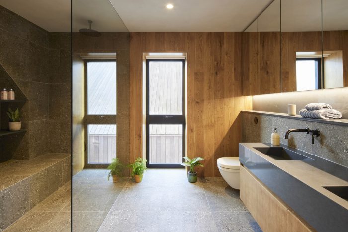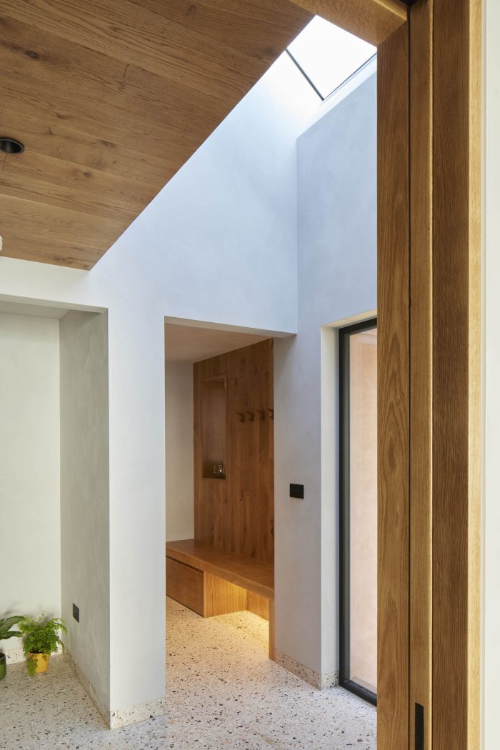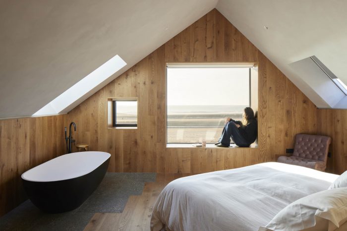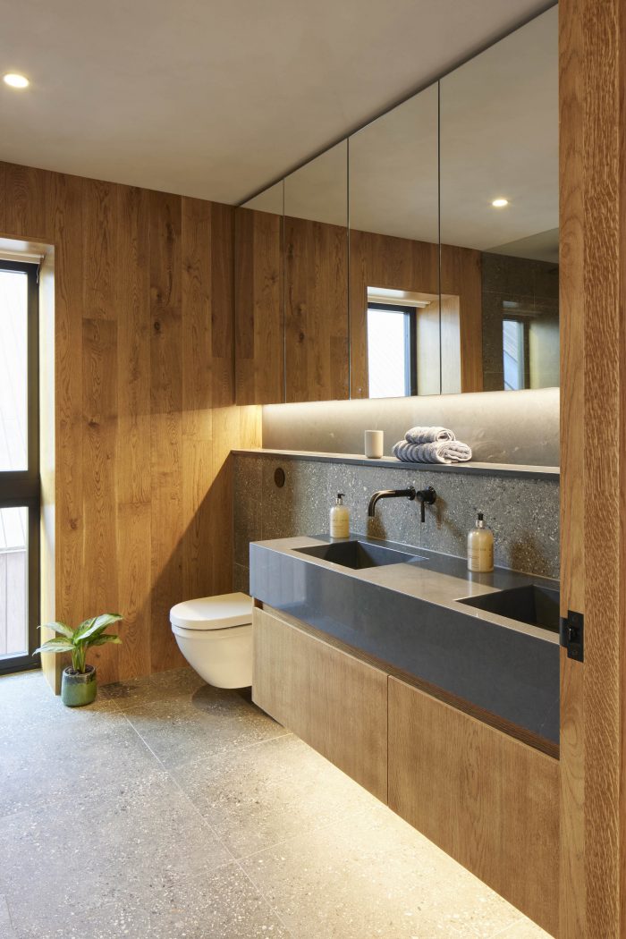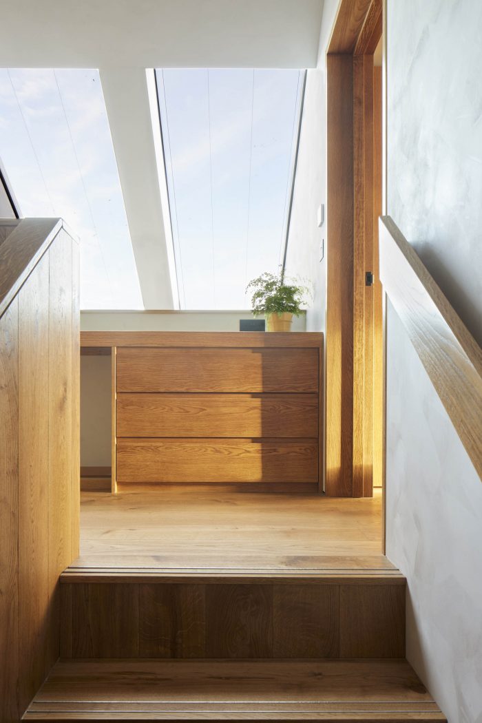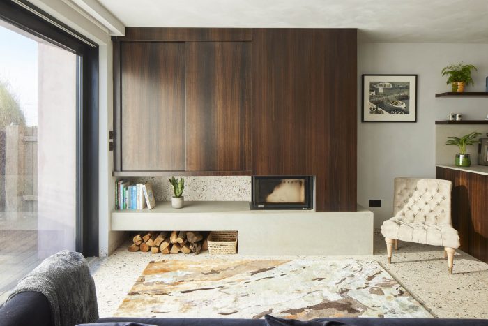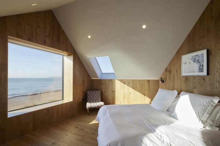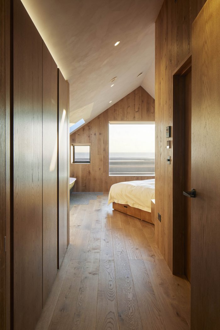 Internally a fumed oak cladding has been used to frame and emphasise the views out and to bring warmth to the interiors. Terrazzo flooring has been used throughout the ground floor with an aggregate mix resembling the shingle of the beach. The walls have been painted in textured natural lime paint to give a more tactile finish.