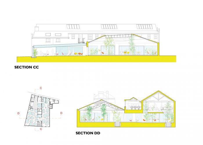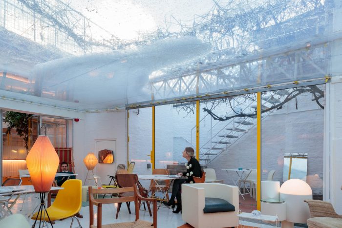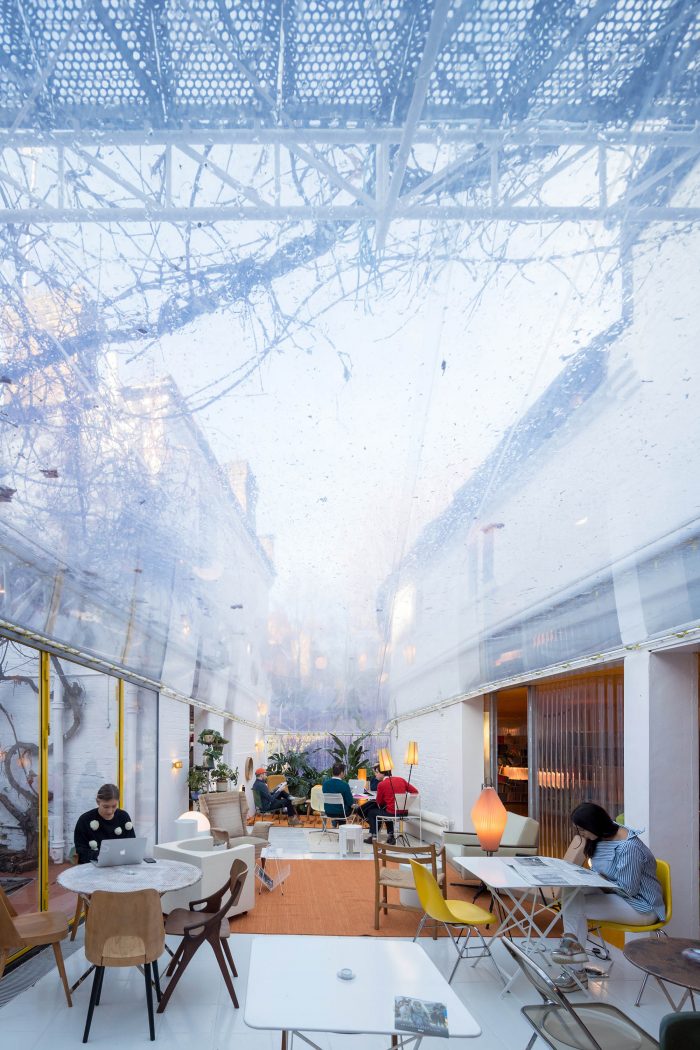 The rest was easy. We needed to expand the existing mezzanine and we opened some more skylights to give more natural light to the people and to the 18 real trees that are now adding more natural history to the place. We also needed to find a way to cover a large part of the courtyard, whilst keeping the vine alive. We used a clear double layer roof, and to insulate it we worked with environmental engineer Adam Ritchie, filling the gap between the layers with soap bubbles. It takes 20 minutes to fill and the effect can last a whole day.