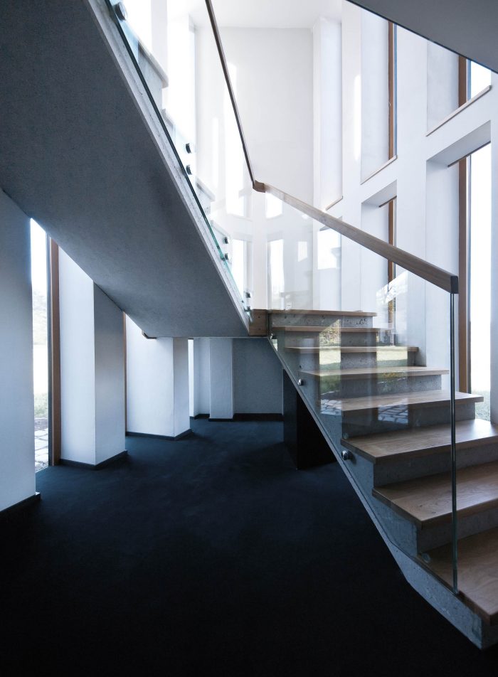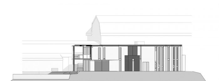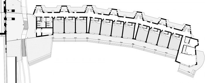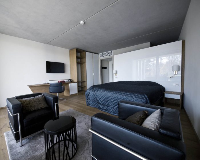The facility is accessed via an art promenade from the historic building. At regular intervals, there are showcases and niches that will be used for changing art exhibitions. The hotel rooms are grouped next to the lake, two suites complete the series of standard-sized hotel rooms.