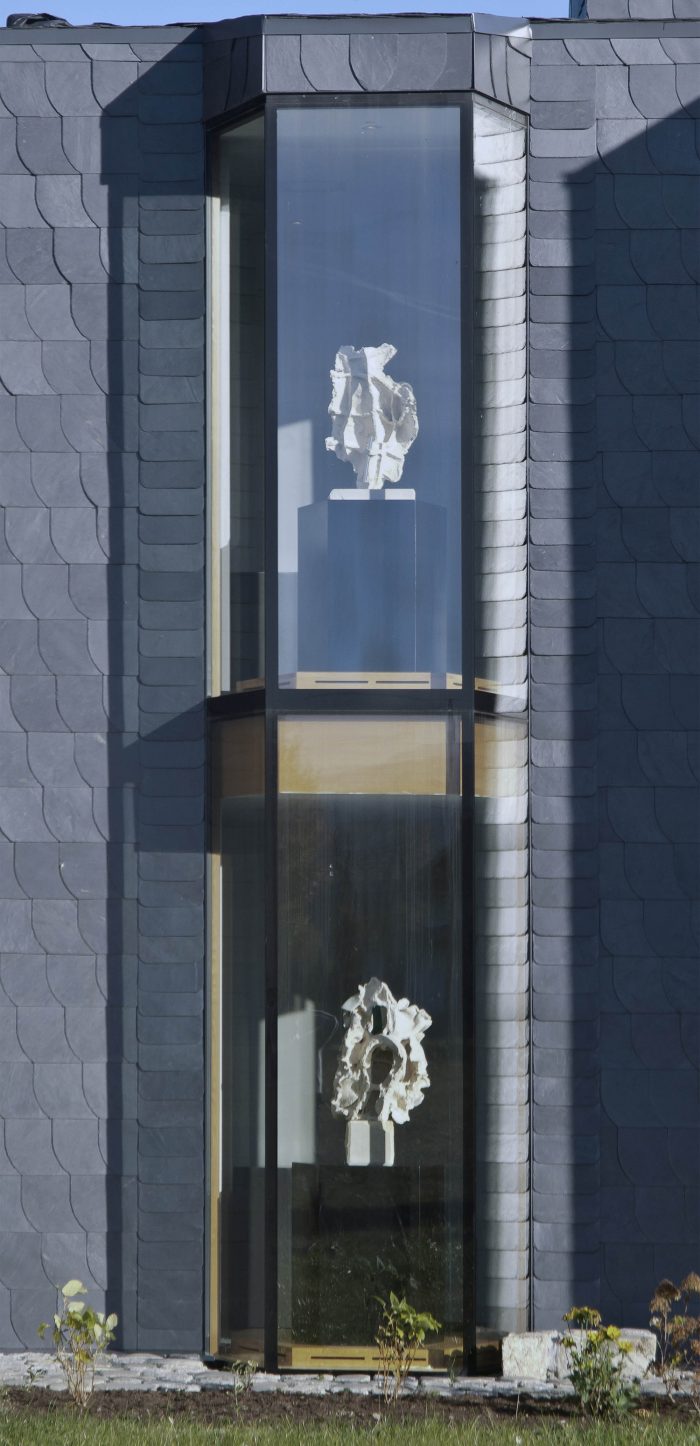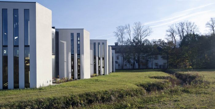 One of these pond ensembles is located directly at the baroque country estate Pakoszow from 1725 and was the inspiration of the „Seehaus“ design. The first pond in this 18-hectare facility was slightly enlarged. Following the shape of the pond embankment, the new building takes on the shape of the historical pond system. With this shape, the Genius Loci is underlined, but also provides acoustic and visual protection from the nearby main road. The creative bridge between the old and the new building was a major challenge. Even though the shape of the new building radically differs from the old palace, the link between these two buildings is established due to the use of authentic materials of the historical building for the new structure (granite, plaster, and slate).