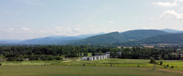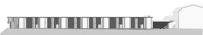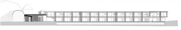Heating takes place via solar heat and wood, as a result, the building is c02 neutral in winter. The large lake directly attached to the facade and the green roof also ensures significant passive cooling in summer. The lake is bio-filtered and opened for swimming purposes in summer.