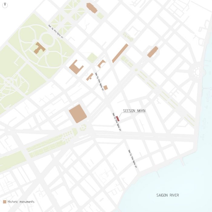 Our renovation of SEESON’s flagship store is located on the ground floor of an office building on Nam Ky Khoi Nghia street, one of the most important axes of Saigon’s heritage. The block, bounded by the four central streets of Nam Ky Khoi Nghia, Huynh Thuc Khang, Pasteur and Le Loi, is filled with urban sediments, the co-existence of multiple layers of various eras, including French villas, Republic-era buildings, commercial buildings.