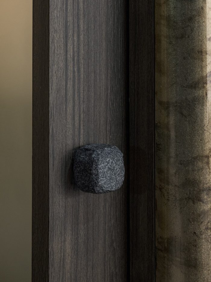 Designstudiominwoo* has created two spaces to feel differently under the concept of "TIMELESS MODERNITY," which does not change over time. The world entering through two roads from the entrance is the same, but it gives a different feeling. The first hall space, which entered through the forked road, reflected faintly with the light falling from the high ceiling, imagining fog in the pond. A quiet stonework is located on the pond, creating an atmosphere of space. Objects with different physical properties made of triangular horns above them become the point of space. The second room space of the forked road is reminiscent of the light from the wall shining through the trees, expressing the beauty of soft light. The space composition of Otsu-seiromushi is largely composed of an entrance, a hall, a room, and a kitchen, and each created a different space scene.