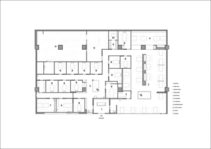 在门面,芦苇静静地吸引着人们的视觉注意力,柜台墙上的灯光欢迎着顾客。主厅的天花板起源于与现有空间不同的高度,但通过利用这一条件,试图通过表达几何形状和天花板设施结构的原貌来实现原建筑。从与空间打交道的顾客的角度来看,每个大厅空间的不同天花板可以有不同的协同体验。在室内的开始,为了给一个点元素,我们试图通过天花板物体的布局和艺术家Tae-soo Lee "石头组成 "来表达安静。