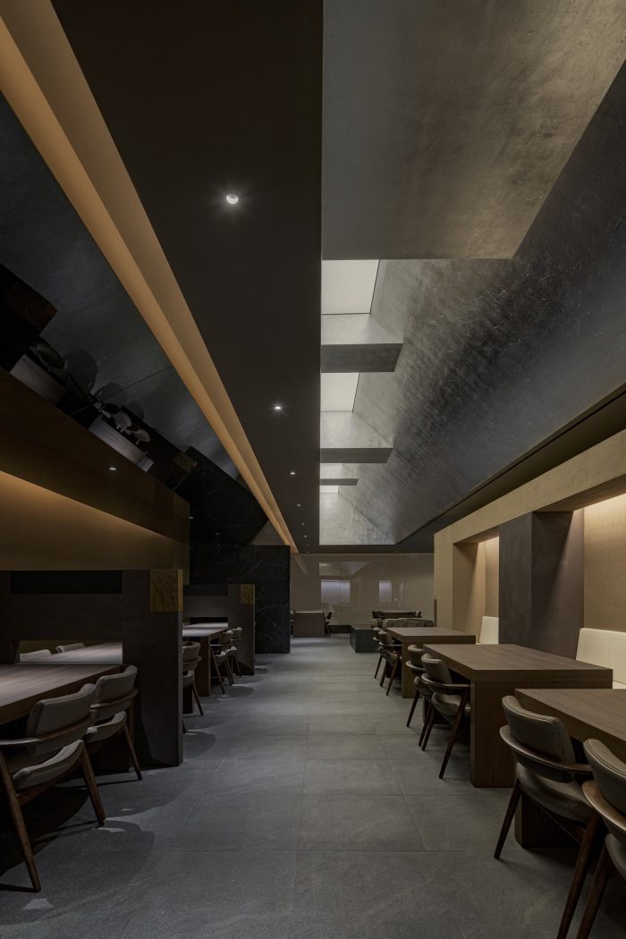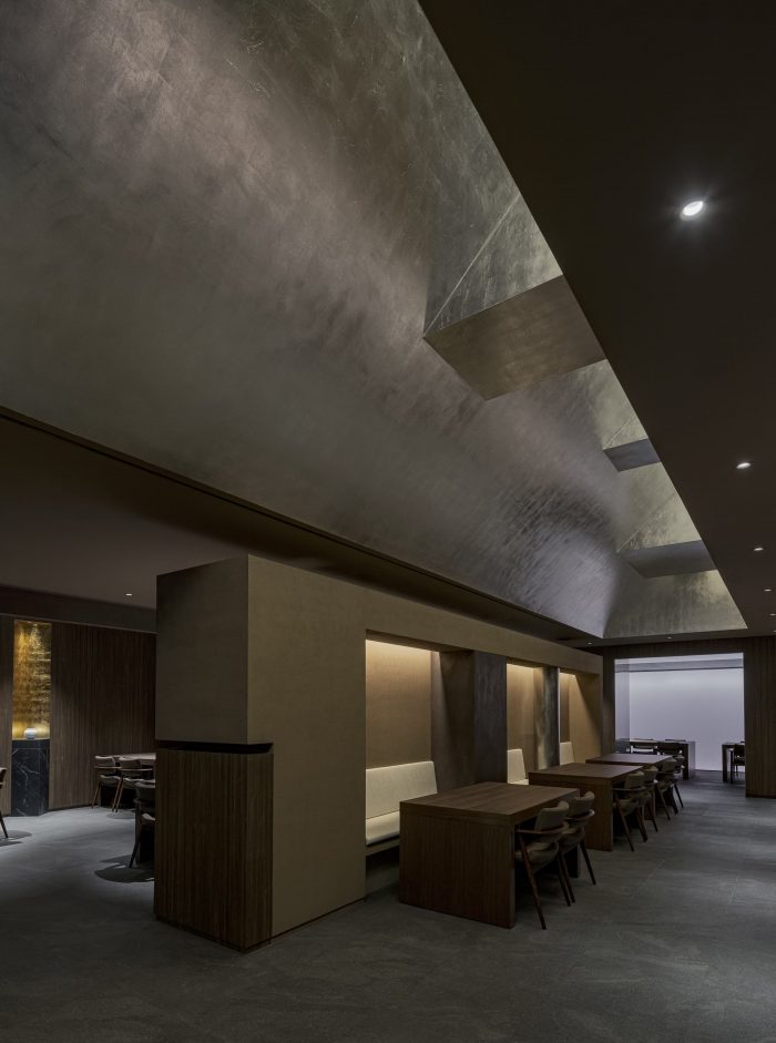 In the facade, the reed's quiet visual attention is drawn, and the light of the counter wall welcomes customers. The ceiling of the main hall originated from a different height from the existing space, but by utilizing this condition, the original architecture was attempted to be realized by expressing the geometric shape and ceiling facility structure as it is. Different ceilings for each hall space can have various synesthetic experiences from the perspective of customers who deal with the space. At the beginning of the interior, in order to give a point element, we tried to express quietness through the layout of the ceiling object and the artist Tae-soo Lee "stone composition."