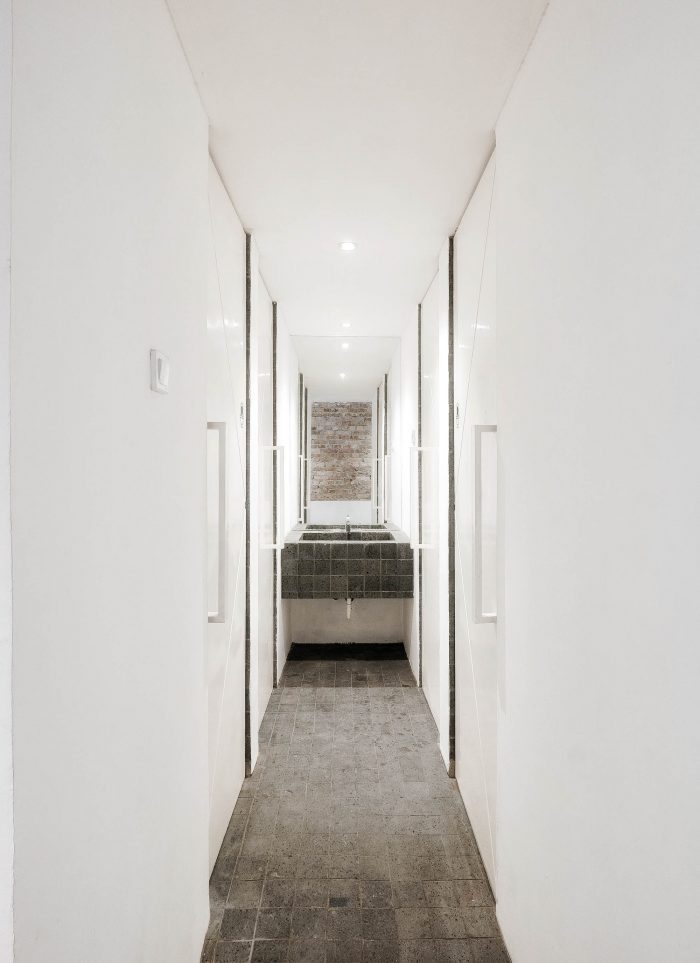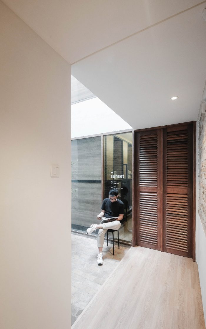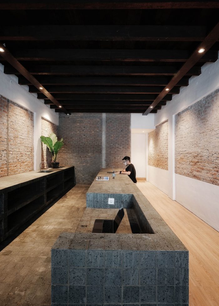 Having to work with a limited budget, we design by subtraction or simplification like removing the wall paint to expose the bricks and eliminating the need for paint then we create a void at the center of the building to let the natural light coming in.