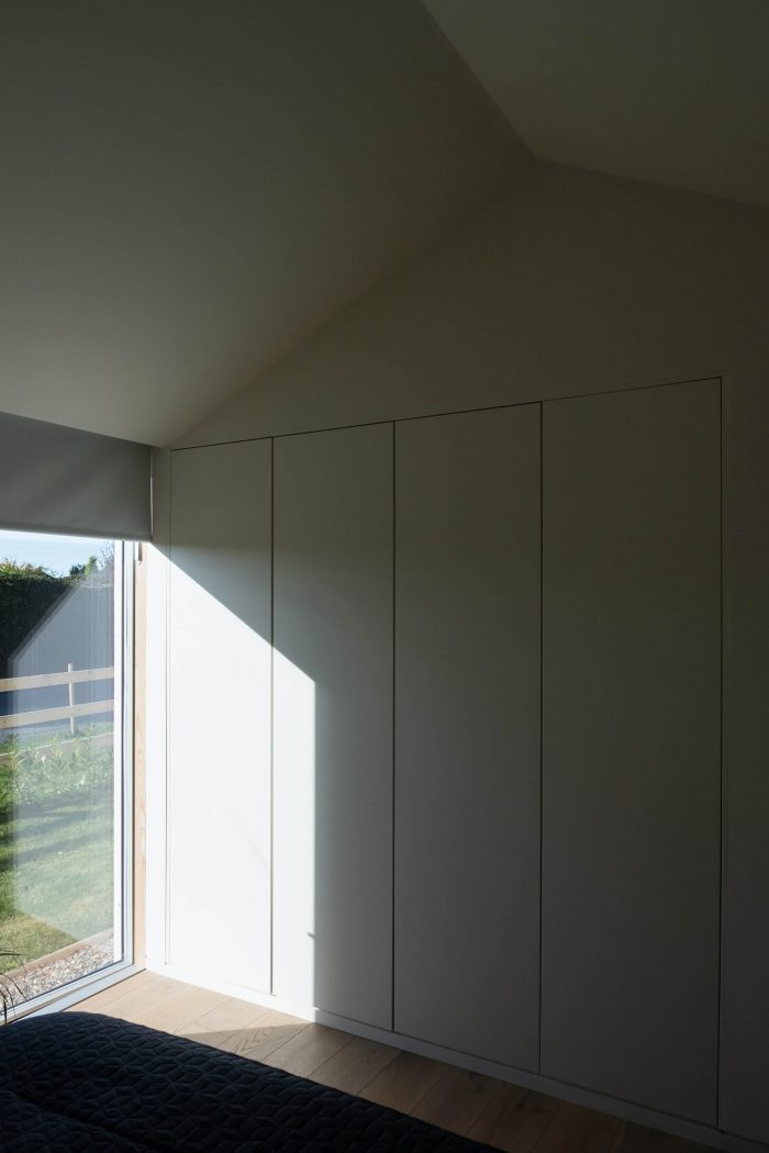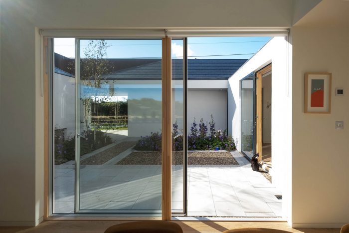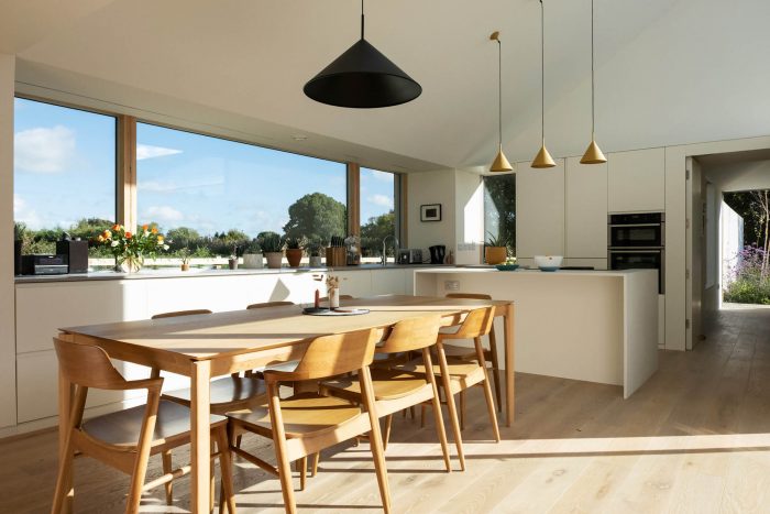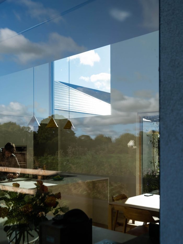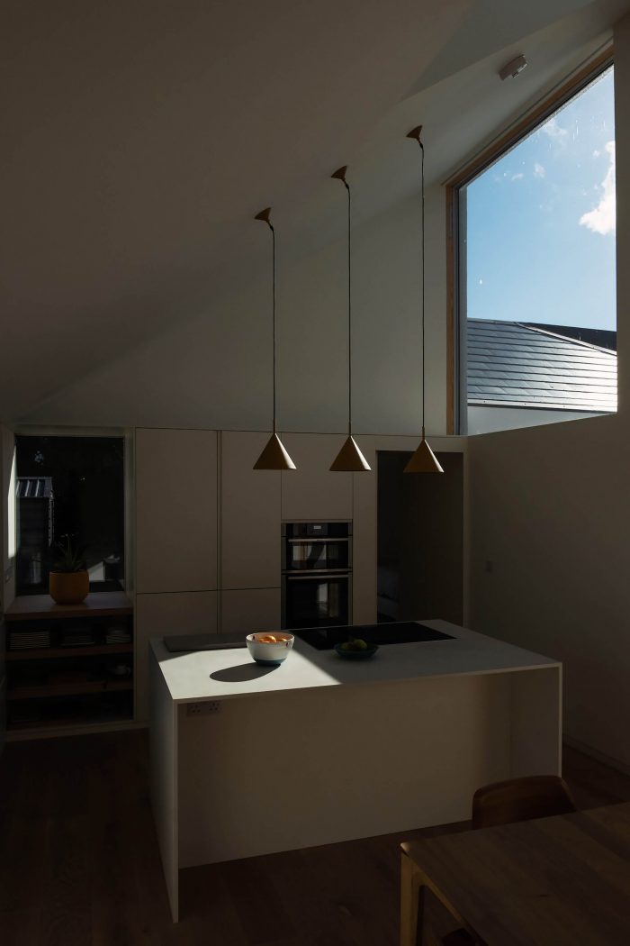 The rooms themselves were designed around optimizing daylight penetration and framing particular views appropriate to each of the spaces. In the dining room along horizontal window frames a view through to the cattle field behind, A low window in the bathroom gives glimpses into the courtyard without exposing the occupant, and in the kitchen, a high window scoops in the southern light and frames views of the beautiful Irish Cloudscapes and so on.