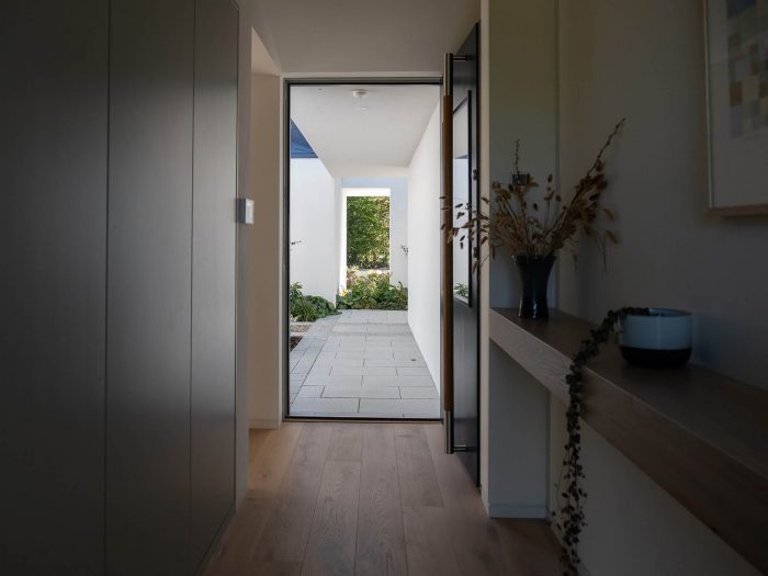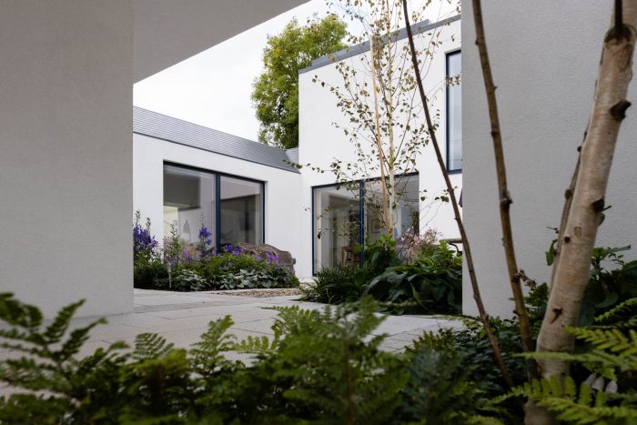 The external forecourt deals primarily with the arrival. The building itself is wrapped around an internal courtyard with each wing carefully positioned in terms of its daylighting and privacy requirements. The bedrooms and private spaces look outwards towards the landscape and the social spaces look inwards towards the inner courtyard providing visual connections across the spaces. A third planted courtyard was positioned between the external forecourt and internal courtyard. This blurs the boundaries between inside and outside. It also serves to control views and the approach to the building as the inner world slowly reveals itself from the outside.