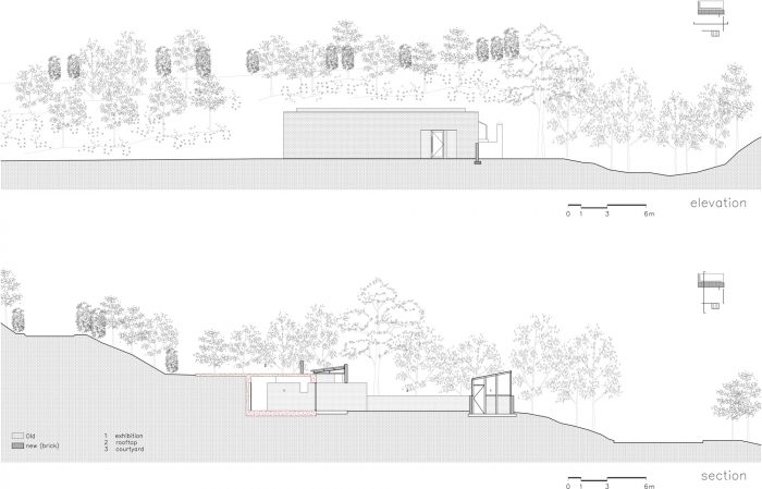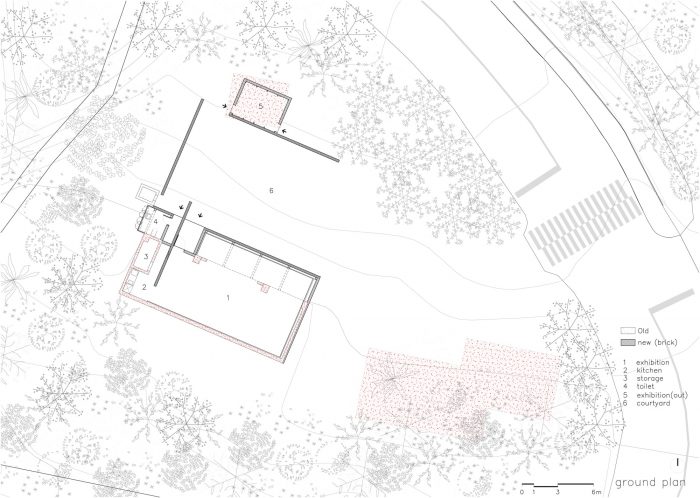 创造一个新的景观和高雅的氛围。虽然视觉是有方向性的,但声音是没有方向性的。视觉使人们变得被外部所吸引,而声音则通过内在的深度为我们提供经验。当我们看什么东西时,声音就会接近我们。建筑物对我们的注视没有反应,但声音在建筑物中回响,进入我们的耳朵。一旦我们进入这里,我们的眼睛就会注视着离这里很远的栅栏上的森林,我们所有的感官都被踩在地上的碎石上和风经过山的声音所支配。然后,建筑只作为背景存在,我们的感官被这个地方的气氛所宣泄。城北道院的第二和第三间展览室是在原来的荒废的房子里重新建造的。但新的材料和墙壁使它们具有高雅的气氛。我们将空间扩展到有屋檐的地方,并在拆除混凝土盒子后将窗户堵住,然后重新安装屋檐。我们还在拆除木质结构的棚子后,运用新的技术和施工方法规划了一个室外展览厅,没有比鬼屋更好的了。我们以简单的方式创造了一个新的氛围,扩展了空间,建立了地域性,只通过墙壁。