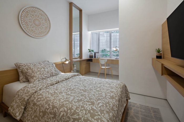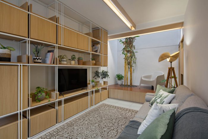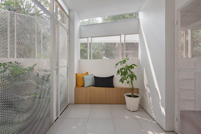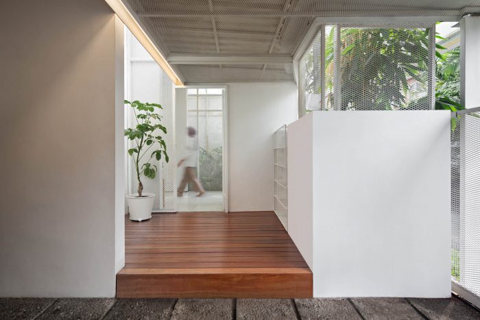 Serindang house is dominated by white on the exterior and interior, with a combination of light wood furniture to make the room feel more spacious. The use of perforated iron in the front area of the house aims to act as a barrier between the outside and inside, but still be able to enter light into the house. To get around the room that is a bit narrow, built-in-furniture is used to maximize the use of the corners of the room as storage. The ladder is also made to float so it doesn't take up space at the bottom and gives a light impression to this house.