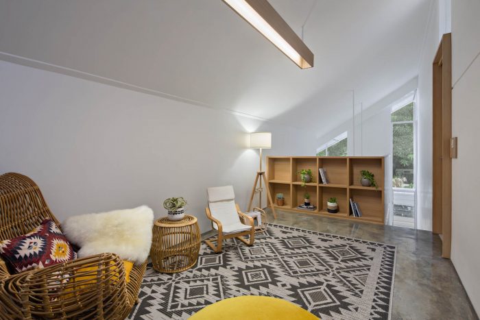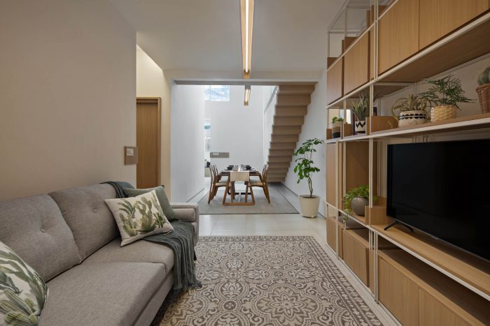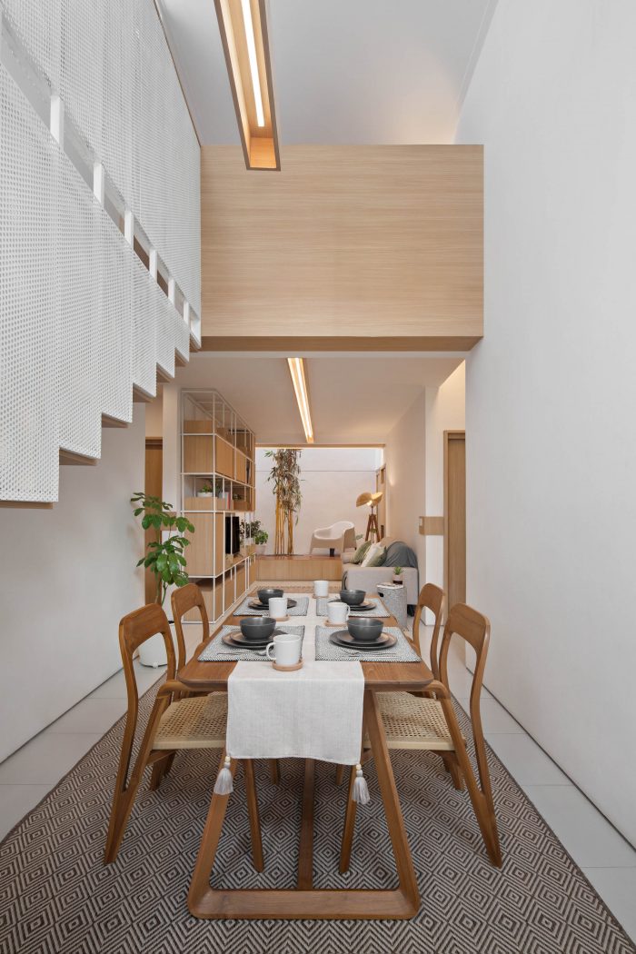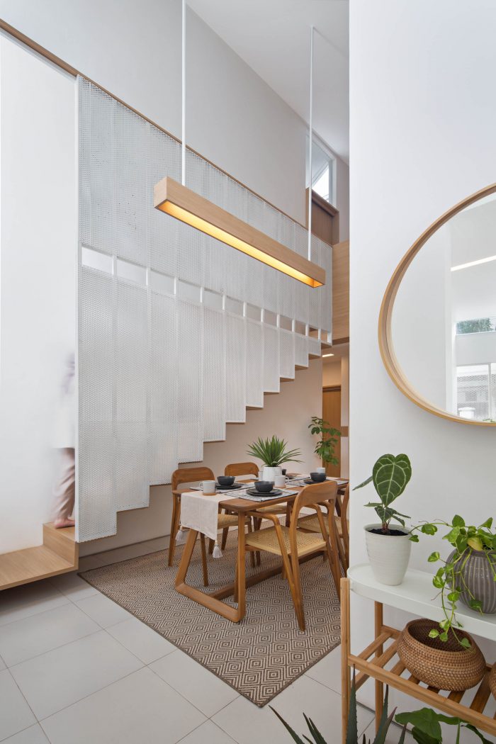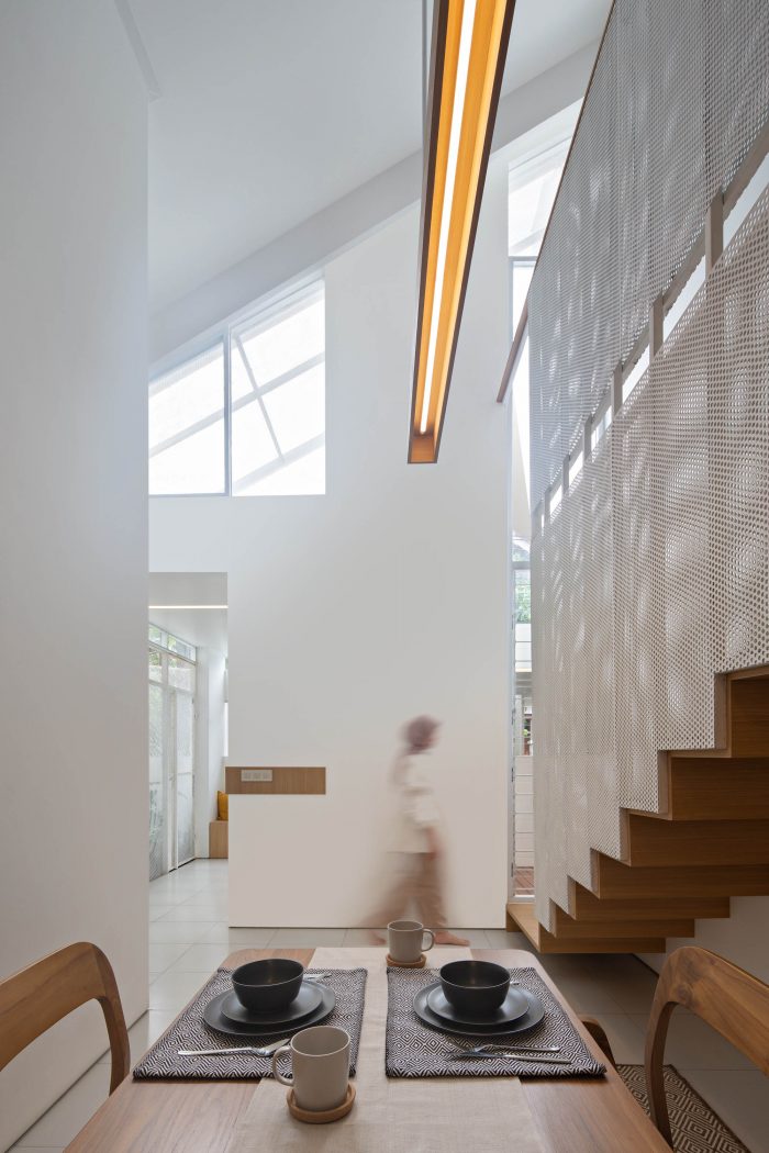 Serindang房子的外部和内部都以白色为主,结合浅色木质家具,使房间感觉更宽敞。在房子前面的区域使用穿孔铁,目的是作为外部和内部之间的屏障,但仍然能够将光线进入房子。为了绕过这个有点狭窄的房间,使用了内置式家具,以最大限度地利用房间的角落作为储藏室。梯子也被做成浮动的,所以它不占用底部的空间,给这个房子带来了轻盈的印象。