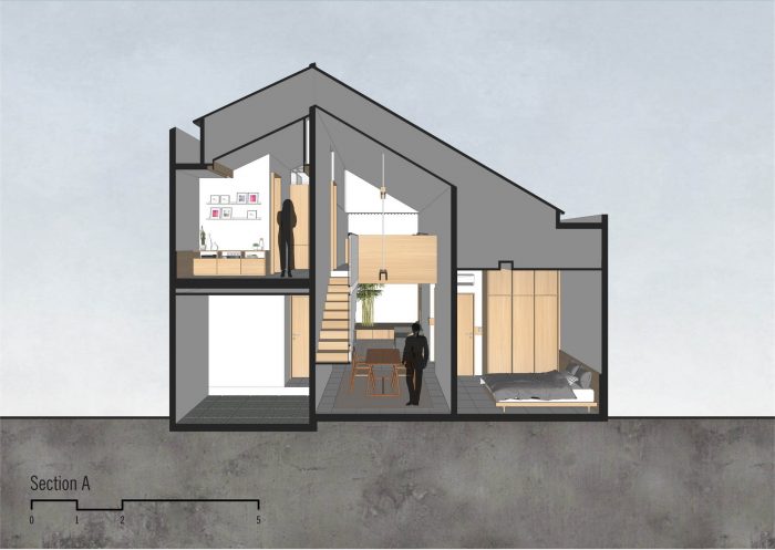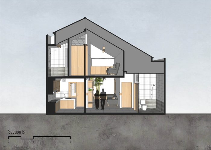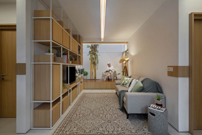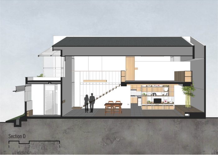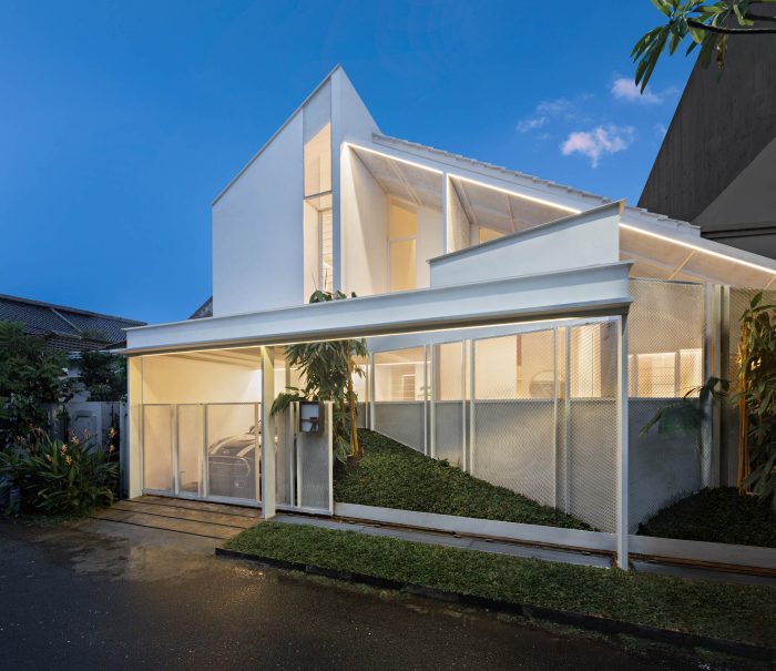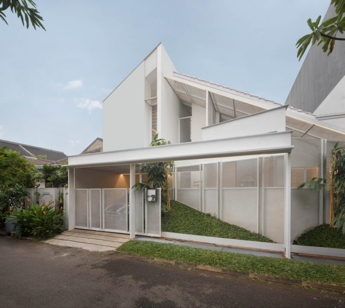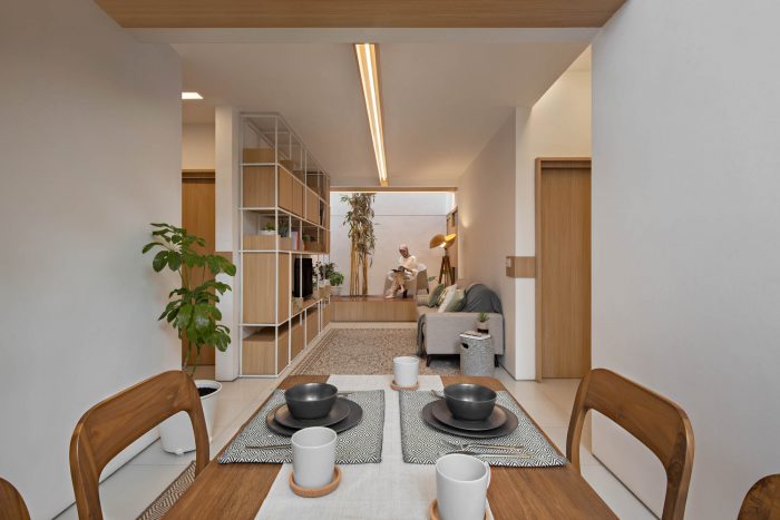 Another thing to focus on is maximizing air and light circulation in the house. The addition of large openings, the existence of skylights, and the provision of a dry garden inside the building are expected to be able to answer these issues. The room is also made open without a partition from the entrance to the back garden. The addition of a bedroom on the 2nd floor makes the appearance of Serindang House (Half House) facade which initially has a sloping plane on one side becomes 2 roofs of different heights so that it has an asymmetrical impression.