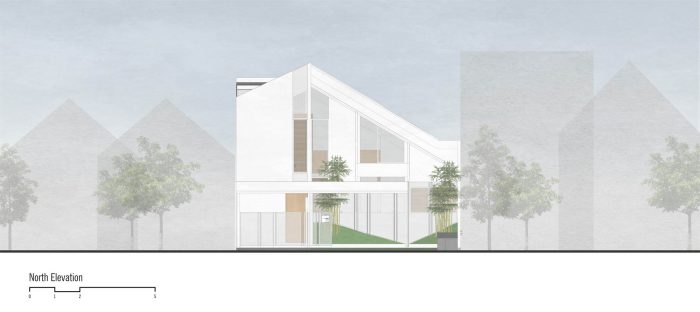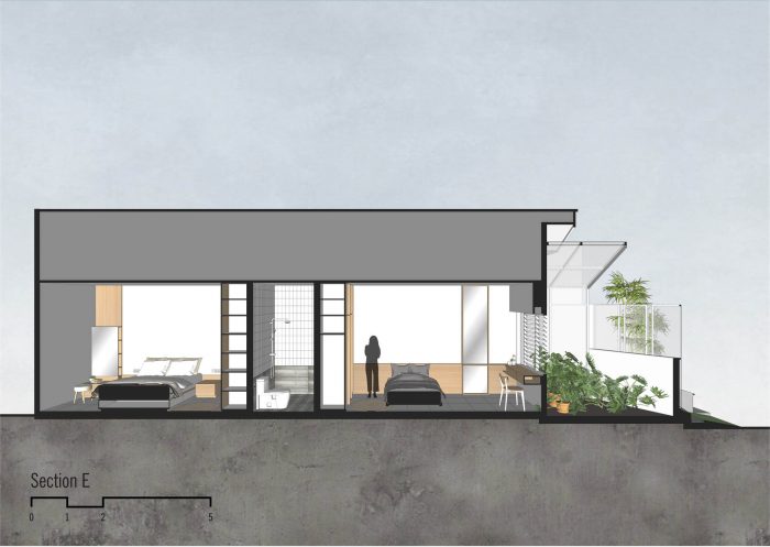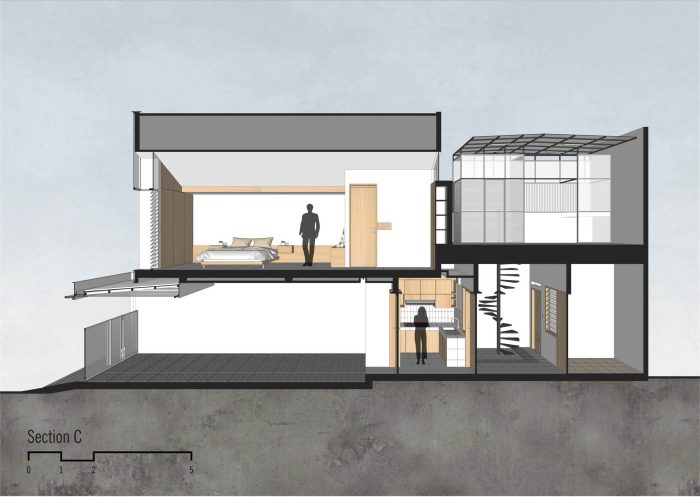 另一件需要关注的事情是最大限度地提高房屋内的空气和光线流通。增加大的开口,天窗的存在,以及在建筑内部提供一个干燥的花园,预计能够回答这些问题。从入口到后花园,房间也是开放式的,没有隔断。在2楼增加一间卧室,使Serindang房子(半边房子)的外观,最初有一个倾斜的平面,变成了2个不同高度的屋顶,所以它有一个不对称的印象。