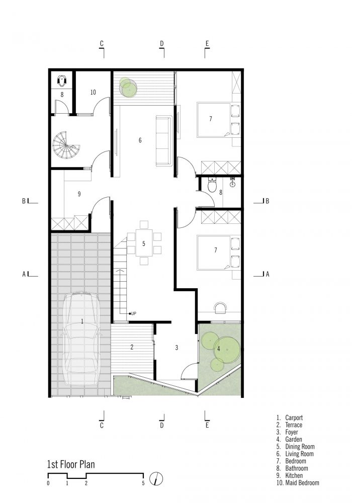 该项目是一个位于雅加达的住宅改造项目。它最初建于2002年,名为Half House,是一个面积为100平方米的单层房屋。随着家庭成员的增加,客户需要在这个房子里有更多的空间。现有的建筑在空间和设计方案上不能满足客户的需求。客户需要一个额外的卧室和浴室,以及一个起居室。这所房子的房间有点窄,但有很高的天花板。为了最大限度地提高天花板的高度,额外的空间被放置在顶层,但仍然考虑到每层的高度。