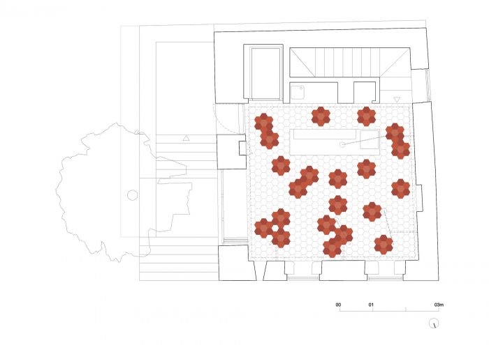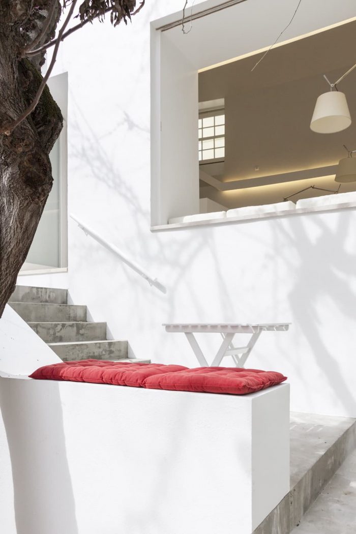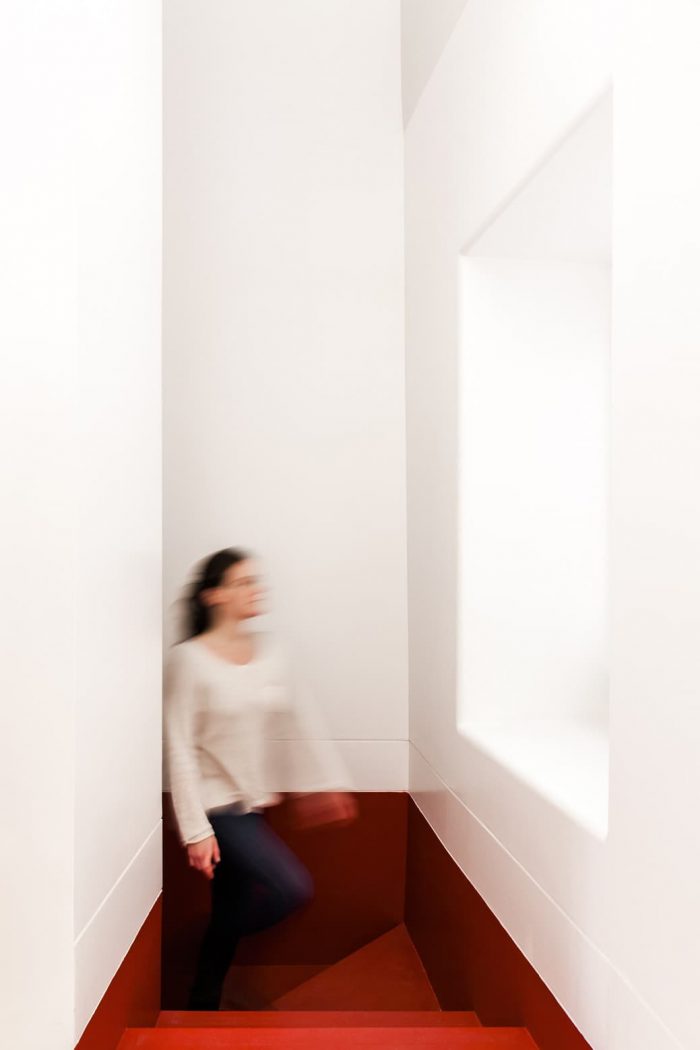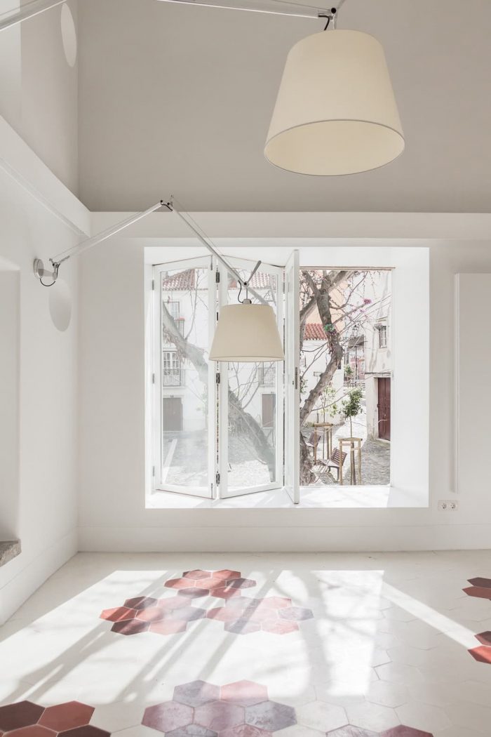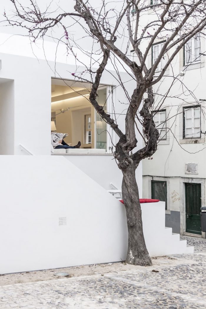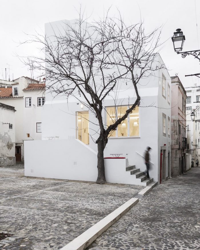 The external staircase acts as an extension of the inner space. Due to its reduced dimension, only 24 m2, we’ve opted to to allow for its extension towards the outside. On warm days, fado can be sung on the upper outdoor landing, transforming it into a stage that opens towards the square and into the city.