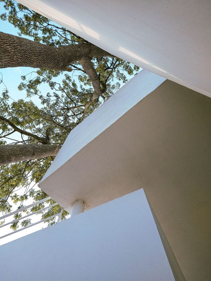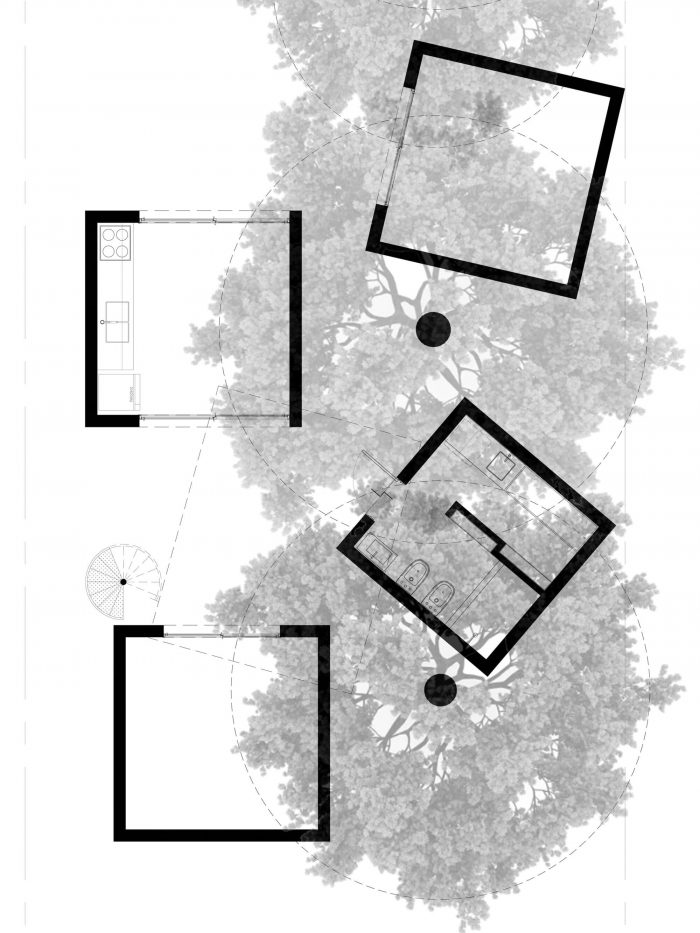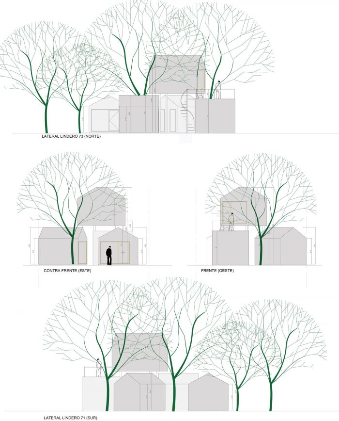 The plot had 4 trees aligned along its length. The proposal not only avoids touching any tree but takes advantage of this situation, as the house is protected under the canopy of the ash trees that form a "green umbrella".